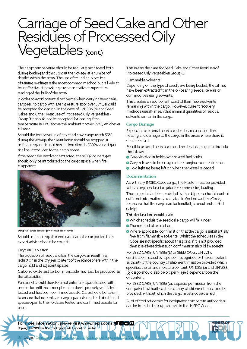 Year: 202x Language: english Author: the North Genre: Practical guide Format: PDF Quality: eBook Pages count: 6 Description: The carriage of seed cake cargoes in bulk has often caused confusion and therefore introduced a high risk of being declared incorrectly. The 2020 edition of the International Maritime Solid Bulk Cargoes (IMSBC) Code, which came into force in January 2021, made some fundamental changes to the seed cake schedules to try to address these issues. This paper outlines the different types of seed cake, their carriage requirements, the hazards these cargoes present and the documentation required. The briefing deals with cargoes falling under all the seed cake schedules of the IMSBC Code. Cargoes falling under the International Code for the Safe Carriage of Grain in Bulk (Grain Code) such as soya beans or sunflower seeds are not included.