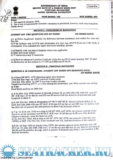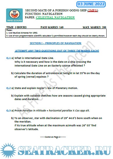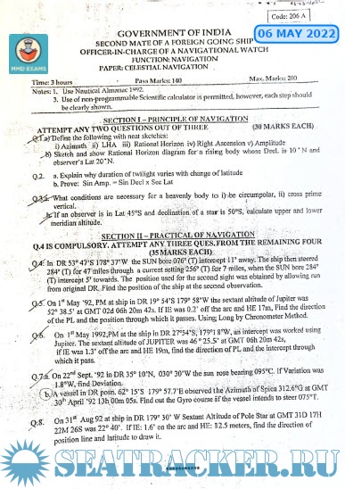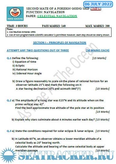 Question Paper Set for Celestial Navigation (July 2022) for Second Mate (F.G.) Mercantile Marine Department (MMD), India Examinations