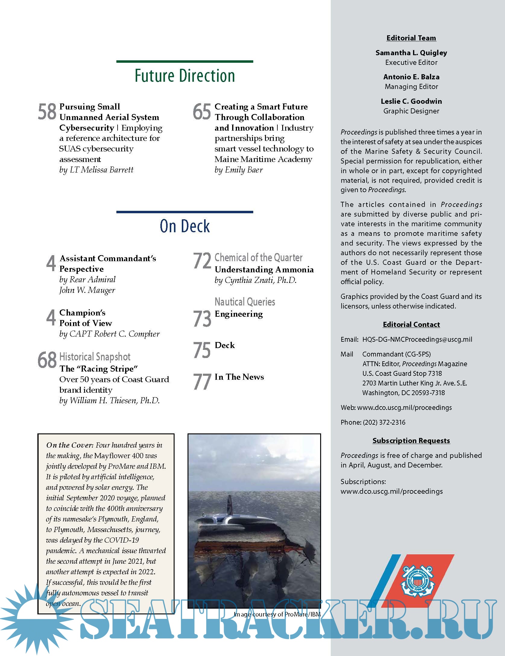 Description: Proceedings of the Marine Safety & Security Council, the Coast Guard Journal of Safety at Sea, is the voice of the Coast Guard’s Marine Safety and Security Council. It began publication in 1944 and, over the decades, has reached an increasing level of recognition among the larger maritime industry and Coast Guard personnel. Currently, over 30,000 copies of Proceedings are mailed out each issue.