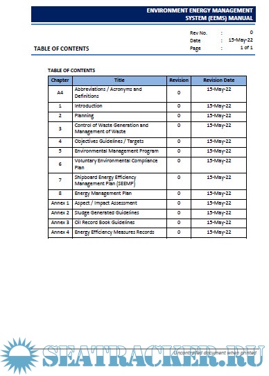 Description: This manual has been prepared to provide ship and shore staff proper understanding of the company`s Environmental Management System, Energy Management System (EnMS) and to implement them.