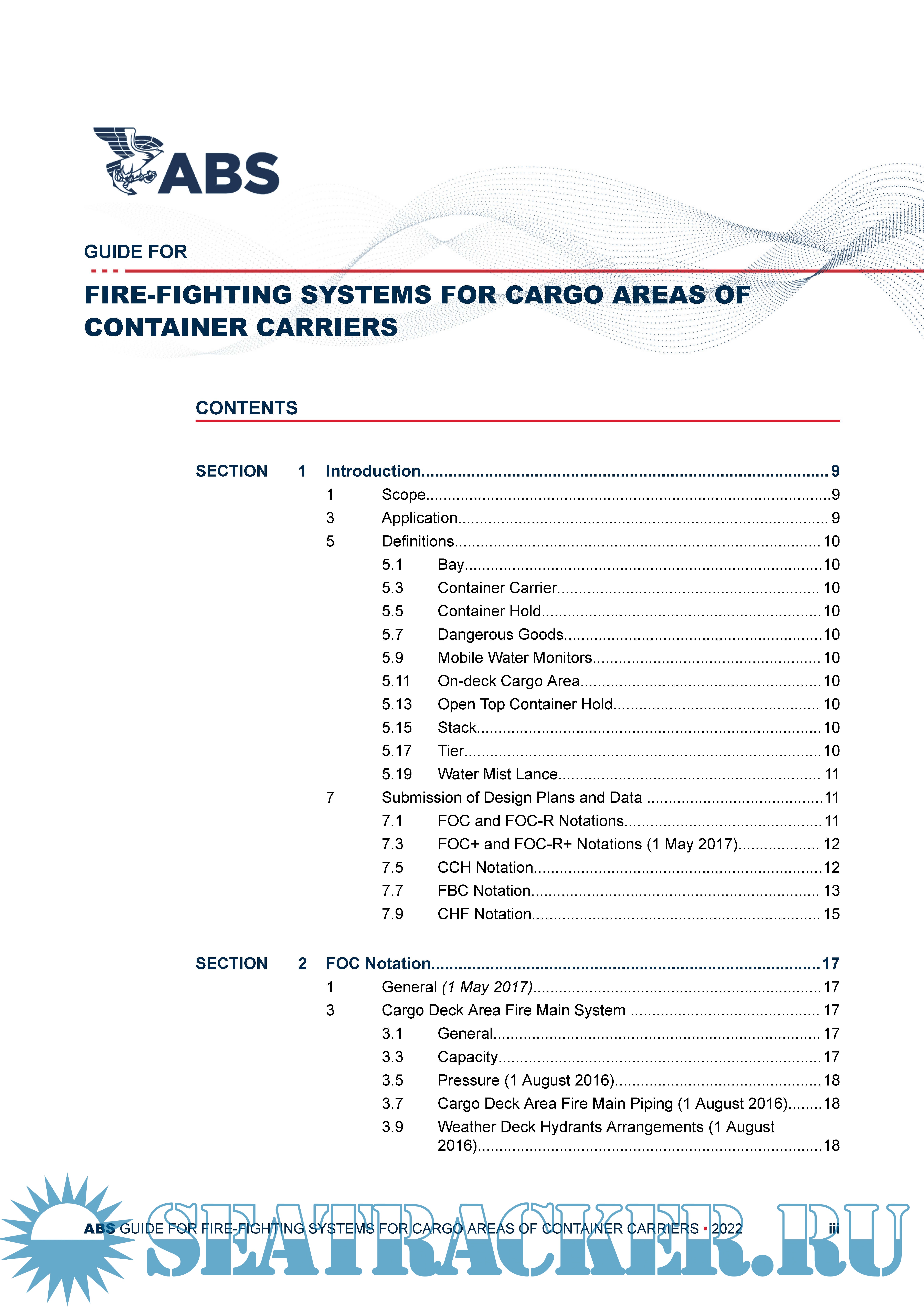 Year: 2022 Language: english Author: ABS Genre: Guide Edition: May, 2022 Format: PDF Quality: eBook Pages count: 61 Description: This Guide provides requirements for enhancement of the fire-fighting and fire protection capabilities for cargo areas of Container Carriers beyond that required by SOLAS. This Guide is for the use of designers, builders, owners and operators in the marine industry and specifies the ABS requirements and criteria for obtaining the following optional notations: ● FOC (Fire-fighting On-deck Container), ● FOC-R (Fire-fighting On-deck Container – Restricted), ● FOC+ (Fire-fighting On-deck Container Plus), ● FOC-R+ (Fire-fighting On-deck Container – Restricted Plus), ● CCH (Container Carrier House/Structures), ● FBC (Fire-protection Below-deck Container), ● CHF (Container Hold Flooding). Container Carriers have grown much larger in recent years and the volume of cargo carried has expanded significantly. Fires involving containers, especially with the volume of cargo now being carried, can present a substantial risk to the safety of the crew and the vessel.