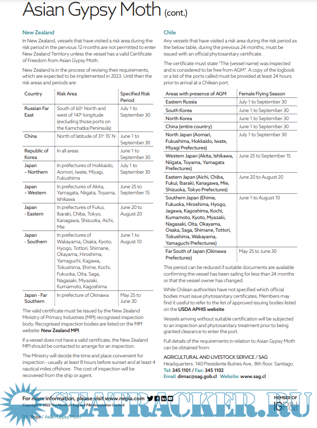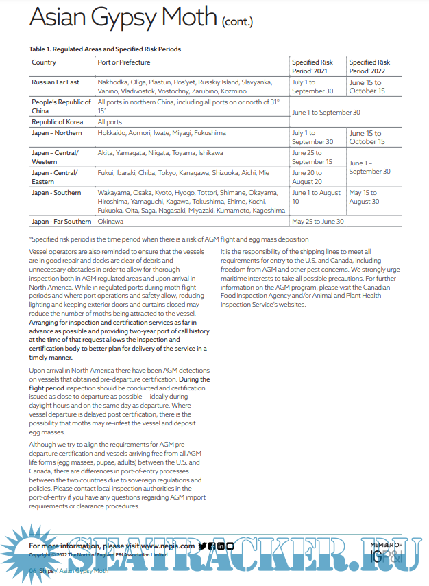 Year: 2022 Language: english Author: NORTH Genre: Practical guide Edition: 2022 Format: PDF Quality: Scanned pages Pages count: 7 Description: Asian Gypsy Moth is the collective name given to a group of insects including the Lymantria dispar asiatica, Lymantria dispar japonica, Lymantria umbrosa, Lymantria postalba and Lymantria albescens varieties. These insects are found predominantly in eastern Russia, northern China and some parts of northern Japan. During the summer, there is a strong possibility they will lay eggs on visiting ships which will then inadvertently carry them to other parts of the world. The problem is that in their larval stage, when they look like caterpillars, the moths are big eaters of all types of plant leaves. The USA, Canada, Australia, New Zealand, Chile and Argentina are thus particularly concerned at the damage Asian gypsy moths might cause to their major forestry and fruit industries. This briefing provides an update of the various restrictions in force in these countries.