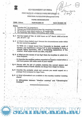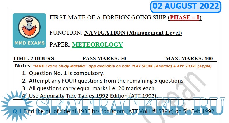 Question Paper Set for Meteorology (August 2022) for Phase I (Chief Mate F.G.) Mercantile Marine Department (MMD), India Examinations