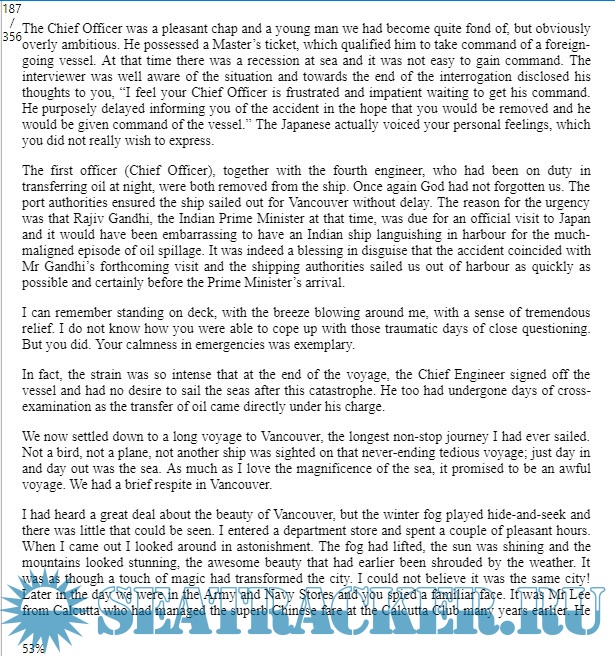 Year: 2007 Language: english Author: Nina Sood Publisher: Stellar Publishers Pvt Ltd Edition: Kindle ISBN: 978-93-82035-08-4 Format: EPUB Quality: eBook Pages count: 356 Description: Sailors have a knack of 'spinning yarns' about their sea voyages that carry them across the global shores. On a dark night bereft of moonlight, the creaking and weird noises emitted by the ship's movements, combined with the sounds of the waves hitting the sides of the vessel, evoke scary memories of ship captains murdered at sea and ghostly apparitions. Life on a cargo merchant vessel is isolated and in a way secluded from the realities of daily life. All the same, there is something whimsical and ethereal about a ship, and you are transported into a terrain, which seems unreal and often personalities change, as the romantic atmosphere takes over encouraging one to leave inhibitions safely ashore. The central figure, Krishan Sood, joined the merchant navy at the tender age of fourteen as a lowly cadet during the early 1940s. It was a time when ships were manned by British officers who spoke with accents alien to him, as was the diet on the ships consisting of roast meat oozing with blood and boiled, bland vegetables. He cheerfully adjusted to the strange environment, worked his way up on the ships, and finally qualified to obtain the ticket of a Master Mariner, to command foreign-going merchant vessels all over the world. His wife, Nina, at a much later stage in life, accompanied him on many of his voyages. As she relates these assorted, engrossing marine experiences, recalling the delightful and unusual episodes of the temperamental seas, simultaneously she also ruminates over Krishan's fight and his losing battle to lung cancer.