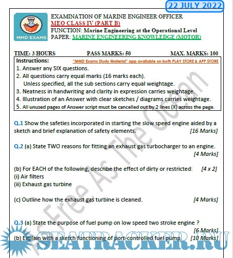 Question Paper for Marine Engineering Knowledge (M.E.K.) Motor (updated July 2022) for M.E.O. Class IV Examinations, India