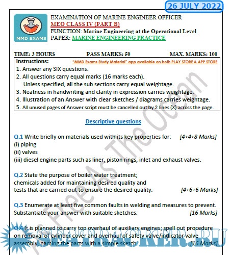 Question Paper for Marine Engineering Practice (M.E.P.) (updated July 2022) for M.E.O. Class IV Examinations, India