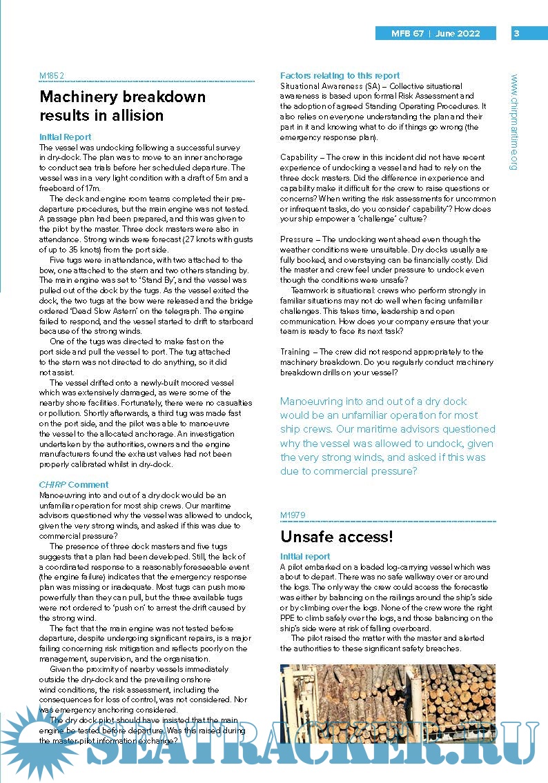 Year: 2022 Language: english Author: CHIRP Maritime Genre: Periodical (magazine) Format: PDF Quality: eBook Pages count: 12 Description: An independent and confidential reporting system for the maritime industry. The Confidential Hazardous Incident Reporting Programme (CHIRP) Maritime reviews and investigates reports of hazardous incidents and near misses by providing an independent and confidential reporting system for the maritime industry. CHIRP Maritime aims to improve maritime safety by providing an independent and confidential reporting system for all individuals employed in or associated with the industry, analysing data and identifying safety trends and informing the community of safety related reports and trends. the quarterly CHIRP Maritime Feedback (MFB) Issue June 2022 Volume 67