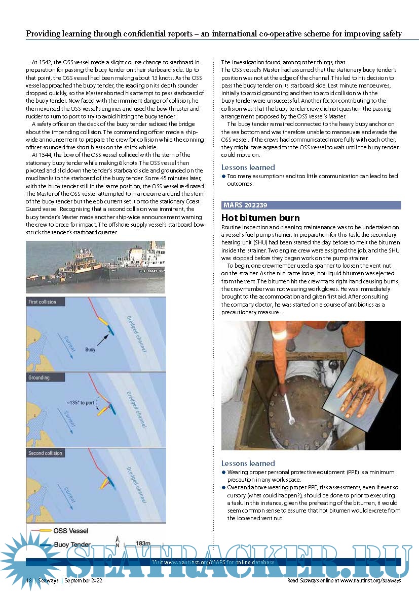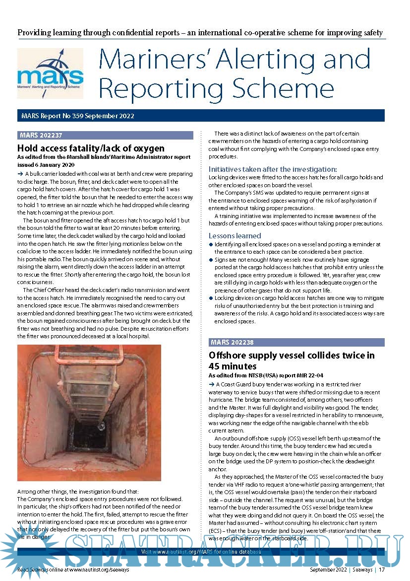 Year: 2022 Language: english Author: The Nautical Institute Genre: Periodical (magazine) Format: PDF Quality: eBook Pages count: 4 Description: Mariners’ Alerting and Reporting Scheme (MARS) Reports issues no 359 dated September 2022 Providing learning through confidential reports – an international co-operative scheme for improving safety. MARS is a searchable database containing reports of accidents and near misses stretching back over a quarter of a century. Funded through the generous support of the Institute's Nautical Affiliate partners, it is one of the maritime industry's leading risk reduction initiatives and is helping to make life safer for seafarers everywhere