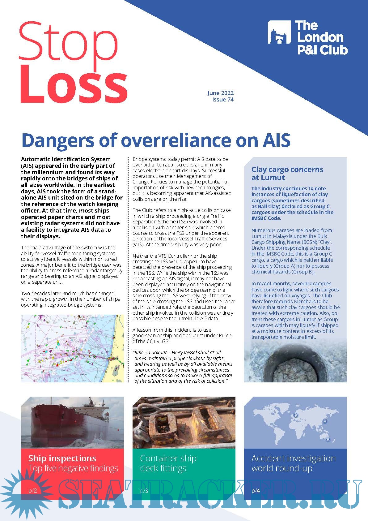 1. StopLoss 73. The London P&I Club joins ISWAN SIDCAR Cyber Security 2021. Accident Investigation World Round -Up2. StopLoss 74. The London P&I Club highlights the dangers of overreliance on AIS. Container Ship Deck Fittings. Accident Investigation World Round -Up