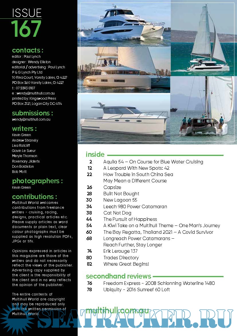 Year: 2021 Language: english Author: Paul Lynch Genre: Periodical (magazine) Edition: July, August 2021 Format: PDF Quality: Photo of pages Pages count: 92 Description: Multihull World is an Australian-based specialist publication devoted to multihull enthusiasts - catamarans and trimarans, offshore, off-the-beach, power, racing and cruising.