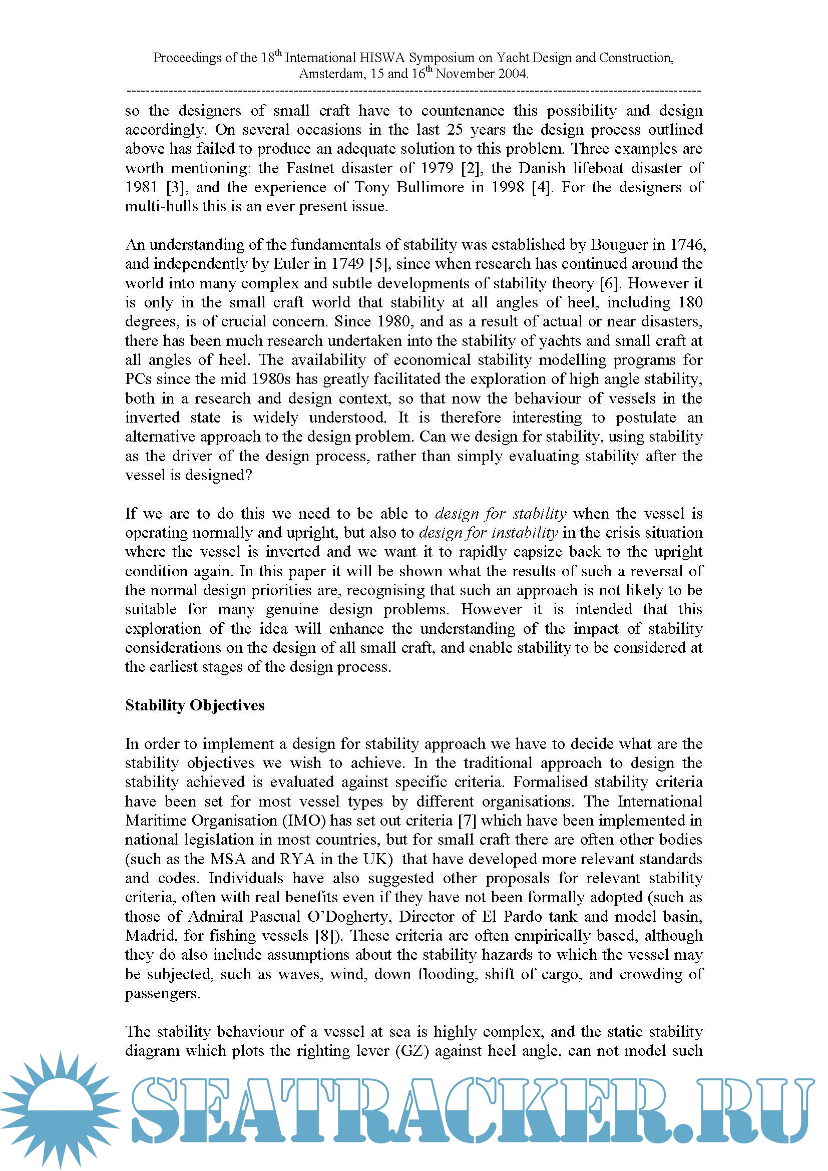 Year: 2004 Language: english Author: Richard Birmingham Genre: Conference Format: PDF Quality: OCR without errors Pages count: HISWA Description: The fundamentals of stability have been understood for over 200 years, however it is only in the last two decades that detailed consideration has been given to the stability behaviour of small craft at very high angles of heel, up to the completely inverted condition. The importance of this knowledge in the design of yachts and other small craft is considered, and the significance of our current understanding is reviewed in the context of procedures based on static stability analysis. The results of undertaking a design exercise with stability as the principal design driver is explored, and the practicality of such a procedure is discussed. Recent research that has produced results relevant to the stability of vessels in the inverted condition is briefly described and reviewed.