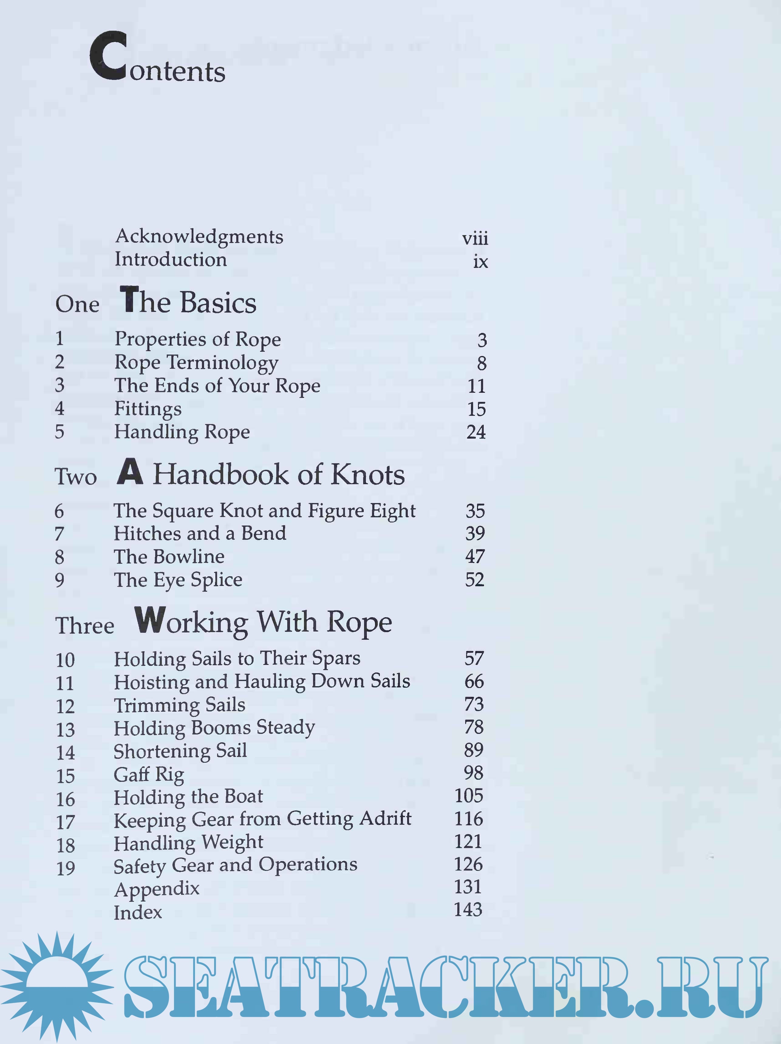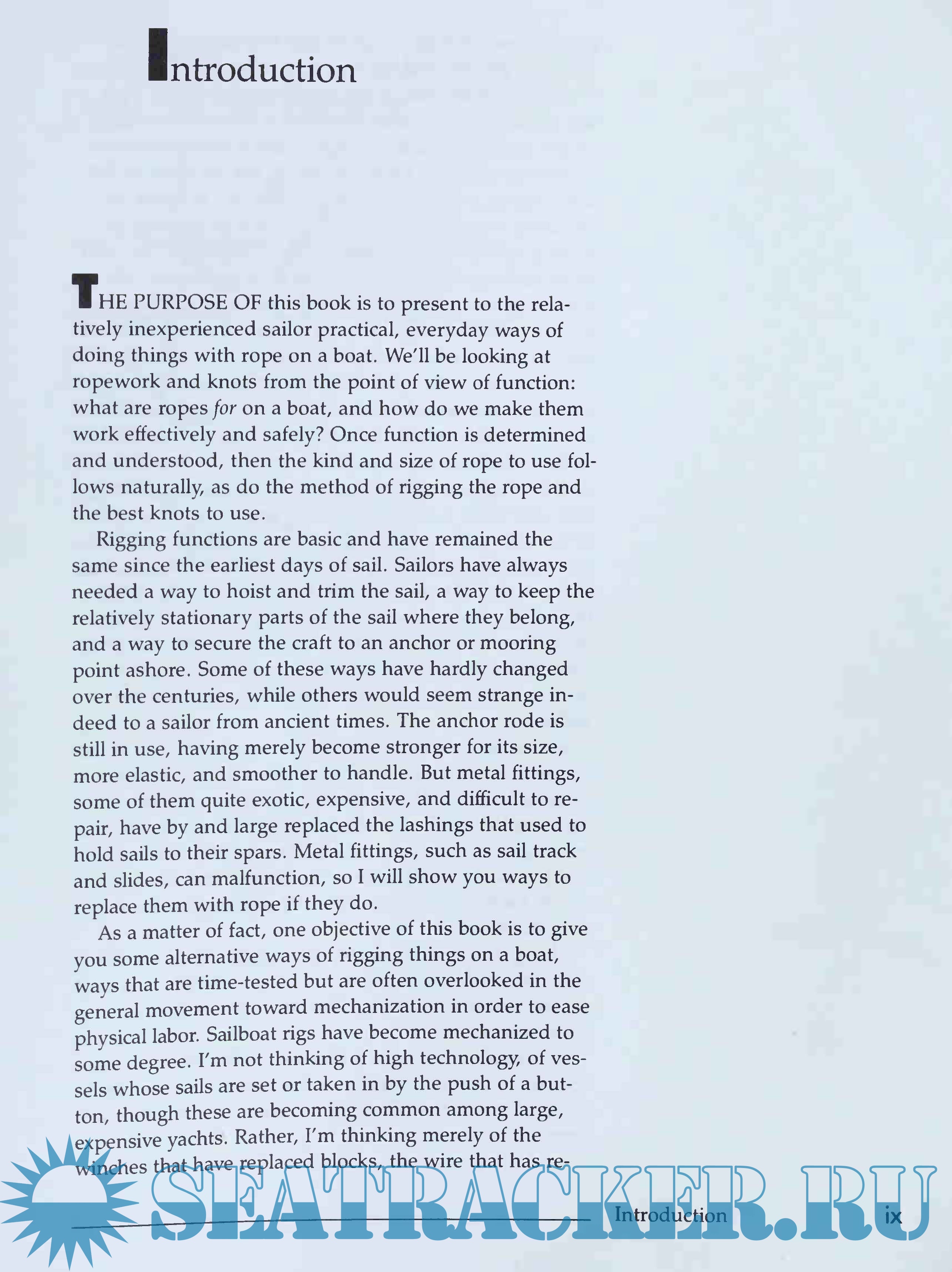 Year: 1989 Language: english Author: Roger C. Taylor Genre: Handbook Publisher: International Marine Publishing Edition: First ISBN: 978-0877423911 Format: PDF Quality: Scanned pages Pages count: 162 Description: Knowing the Ropes provides a lot of information in a concise and easy to read format. Roger Taylor's descriptions are clear and easy for the novice to understand, and the illustrations are top notch, providing all the information you need without confusing and unneeded detail. Rather than bombard you with all the knots possible, the book introduces a few, and then builds on them using practical examples. There's quite a bit on rigging, including rigging small craft, and the almost forgotten gaff rig (chapter 15.) While not as comprehensive, this book compares well to books such as The Rigger's Apprentice at about half the cost.