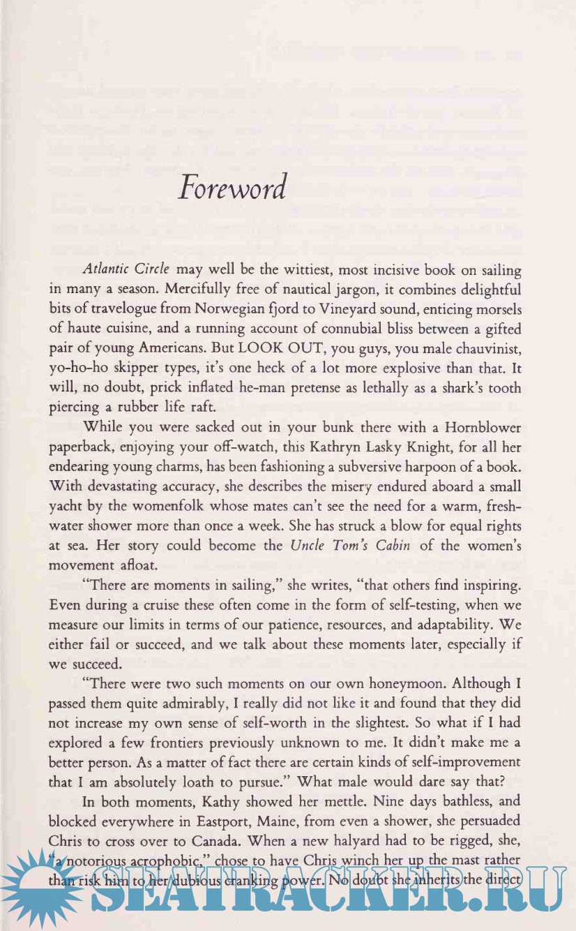 Year: 1985 Language: english Author: Kathryn Knight Genre: Textbook Publisher: W W Norton & Co Inc Edition: first ISBN: 978-0393032956 Format: PDF & EPUB Quality: Scanned pages Pages count: 230 Description: Kathryn Lasky, a midwesterner descended from a long line of recently arrived Russian Jews, married Christopher Knight, a sailor descended from a long line of Grand Banks fishermen and Nantucket whaling captains. Neither fully understood what they were getting into. As a wedding present they were given a thirty-foot ketch, and as they began their honeymoon on Leucothea, Kathryn had a lovely vision of island hopping in Penobscot Bay, Maine. Chris, however, was a voyager, and what began as an idyllic honeymoon extended into an Atlantic crossing, three years of sailing in Europe, and a long voyage home. Ten years and one child later, the voyage was finished, the Atlantic circle completed. And the marriage was still going. Of all the accounts of blue water sail boat cruising, this stands apart. Kathryn did not become a "salt." She remains baffled about a bowline and a mortal enemy of the gimbaled alcohol stove - Her account is a wonderful breath of fresh air; a welcome sound of laughter, and a frank look at life afloat. It is also the story of a marriage, of self-discovery, and of understanding of what a voyage truly means. She says it is unromantic, and yet it is romantic in its look at sailing and what it meant to two very different people and their marriage. Additional info: PDF & EPUB