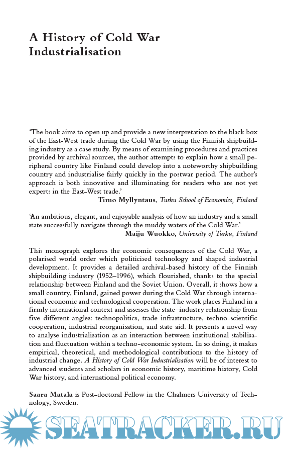 Description: ‘The book aims to open up and provide a new interpretation to the black box of the East-West trade during the Cold War by using the Finnish shipbuild-ing industry as a case study. By means of examining procedures and practices provided by archival sources, the author attempts to explain how a small pe-ripheral country like Finland could develop into a noteworthy shipbuilding country and industrialise fairly quickly in the postwar period. The author’s approach is both innovative and illuminating for readers who are not yet experts in the East-West trade.’