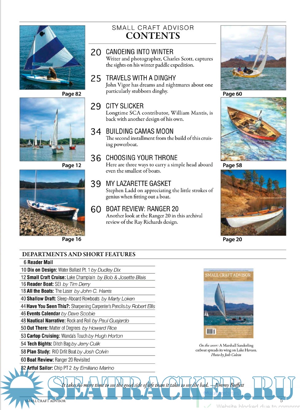 Description: Small boats, big adventure! The only magazine focused on small and trailerable sailboats, cruising, and adventure. Each issue features places to sail, how-to and modification articles, a plan study for the boat builder, and a feature-length review of a production sailboat.
