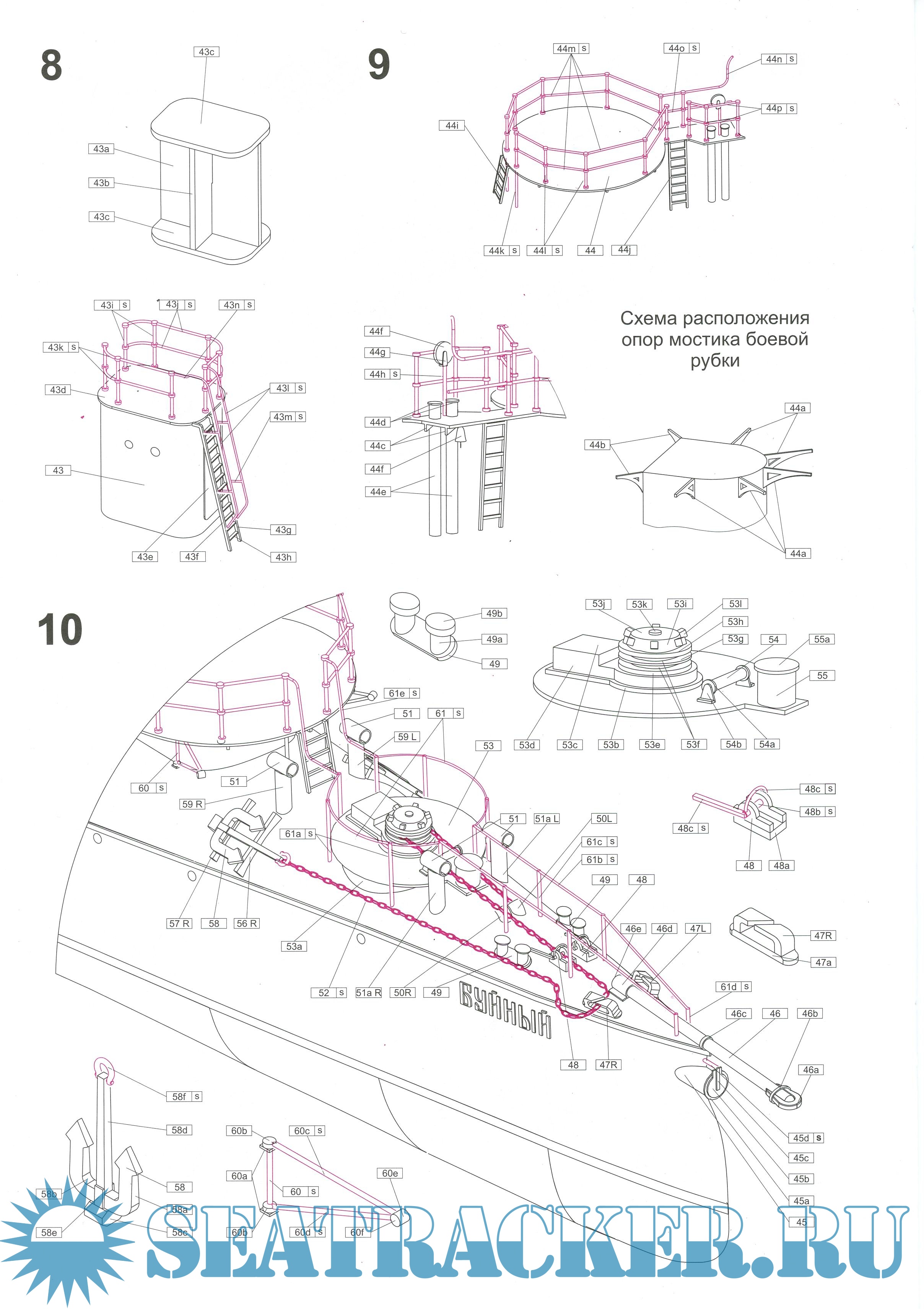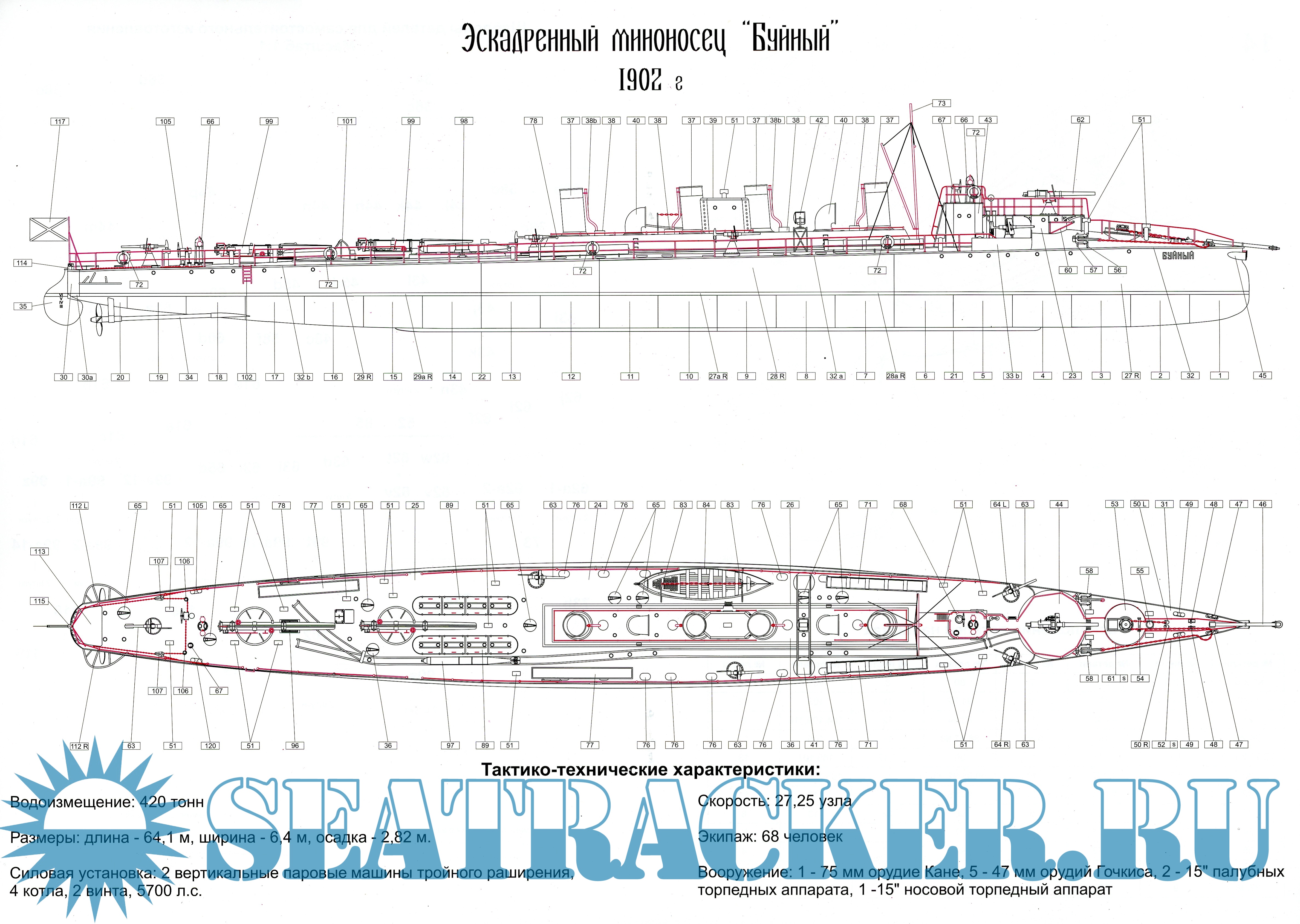 13 листов формата А4 цветных выкроек для создания модели миноносца "Буйный" по состоянию на 1902 год в масштабе 1:100. Инструкция на русском, немецком и польском языках.