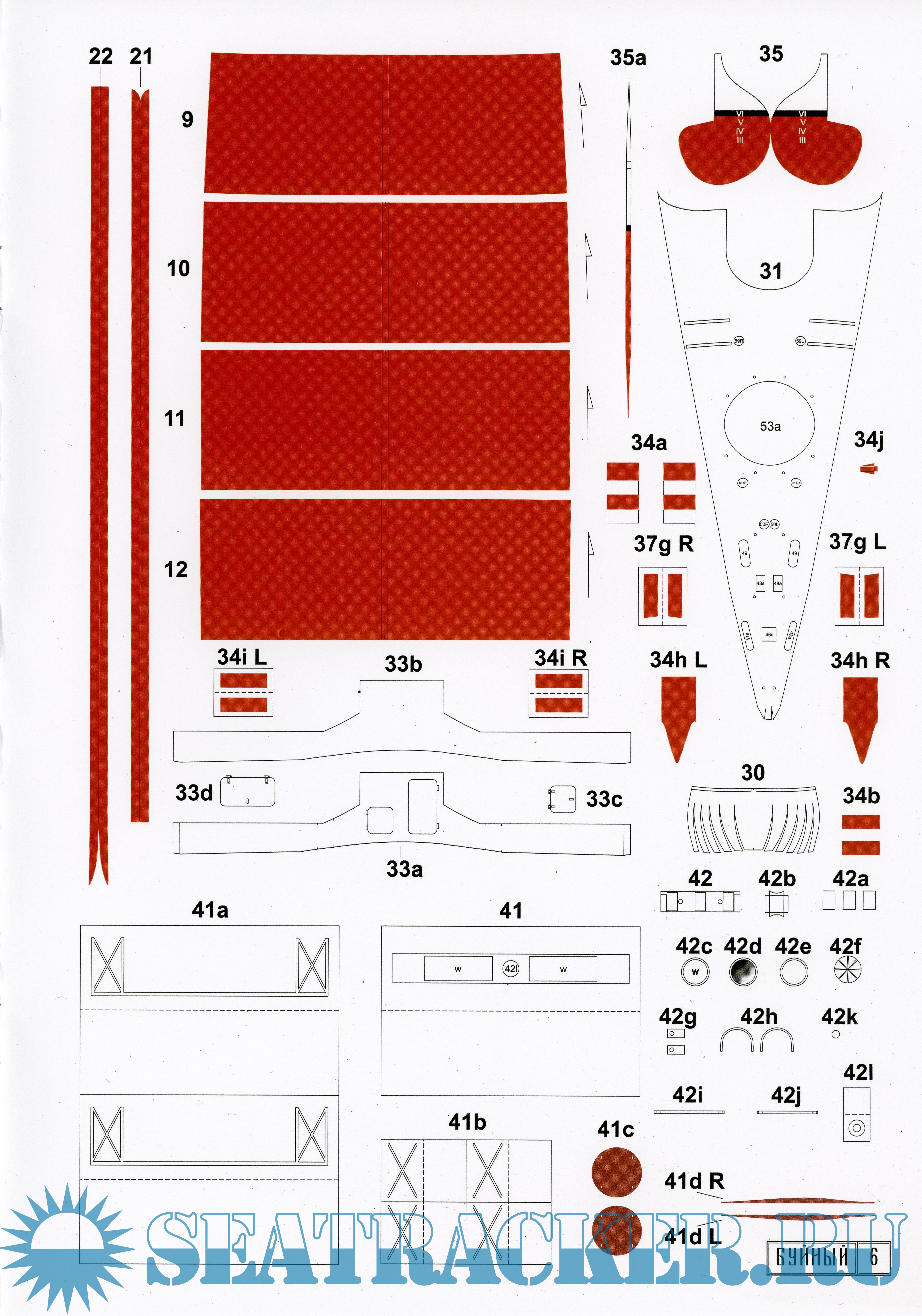 Описание: Модель эскадренного миноносца "Буйный" выполнена в масштабе 1:100 на основе чертежей А.А. Гармашева, М.Л. Соколова и архивных фотографий. Модель не является сложной, но требует аккуратности при сборке некоторых деталей. Перед началом работы следует внимательно ознакомиться с описанием и расположением деталей на листах. Сборка деталей производится в порядке возрастания нумерации. Для придания естественных обводов днище рекомендуется прогрунтовать и покрасить. Некоторые детали изготавливаются самостоятельно согласно приведенным шаблонам.