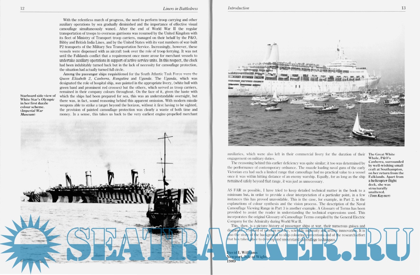Year: 1989 Language: English Author: David Williams Genre: History Publisher: Vanwell Publishing Limited Format: PDF Quality: Scanned pages Number of pages: 81 Description: FROM VIRTUALLY the beginning of the age of steam at sea, merchant passenger vessels have been appropriated during times of war to perform auxiliary duties in support of armed forces. In this work they have served their countries' needs throughout these periods of adversity as dutifully and successfully as they served those of international trade and travel in more halcyon times. Indeed, ocean passenger ships have proved to be so suitable for emergency work, with their vast and readily adaptable accommodation spaces and high speeds, often superior to Contemporary warships, that in wartime they have been converted to serve in many very different capacities - as troopships, auxiliary cruisers, hospital ships, commerce raiders, accommodation ships and aircraft carriers, as well as in a number of even more specialised roles.