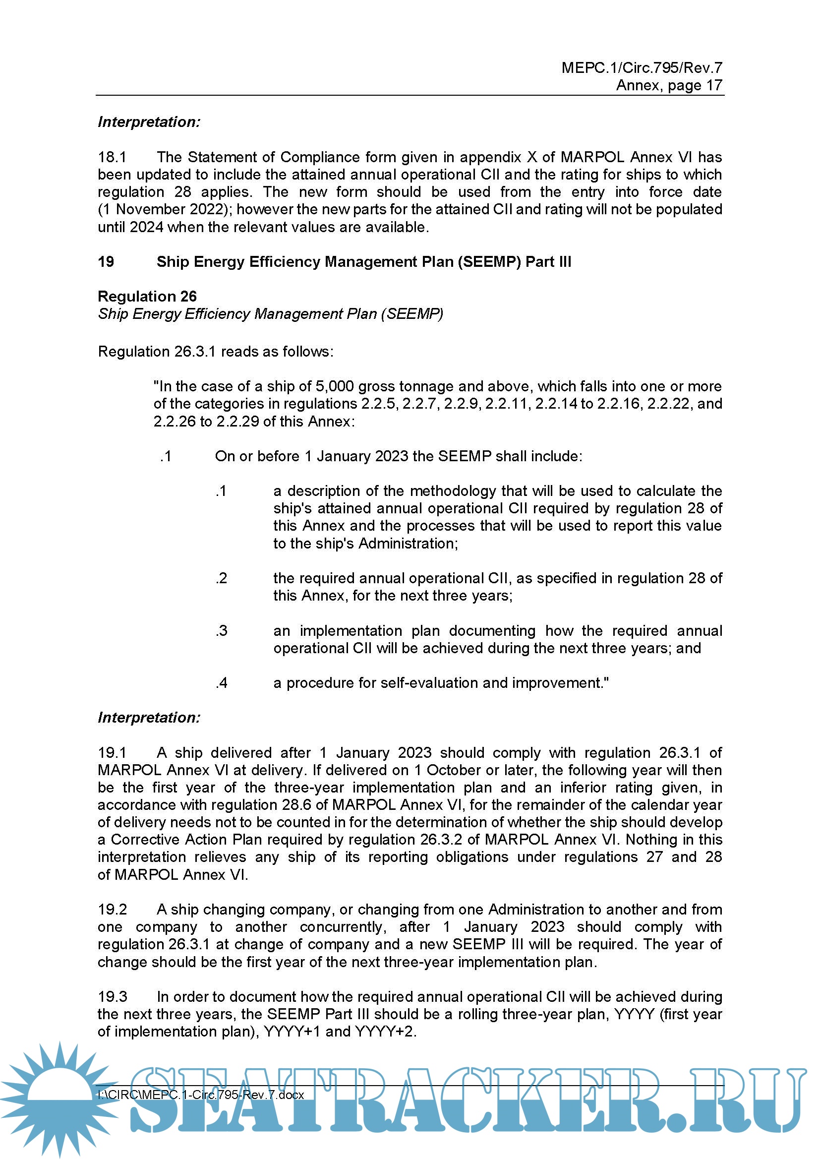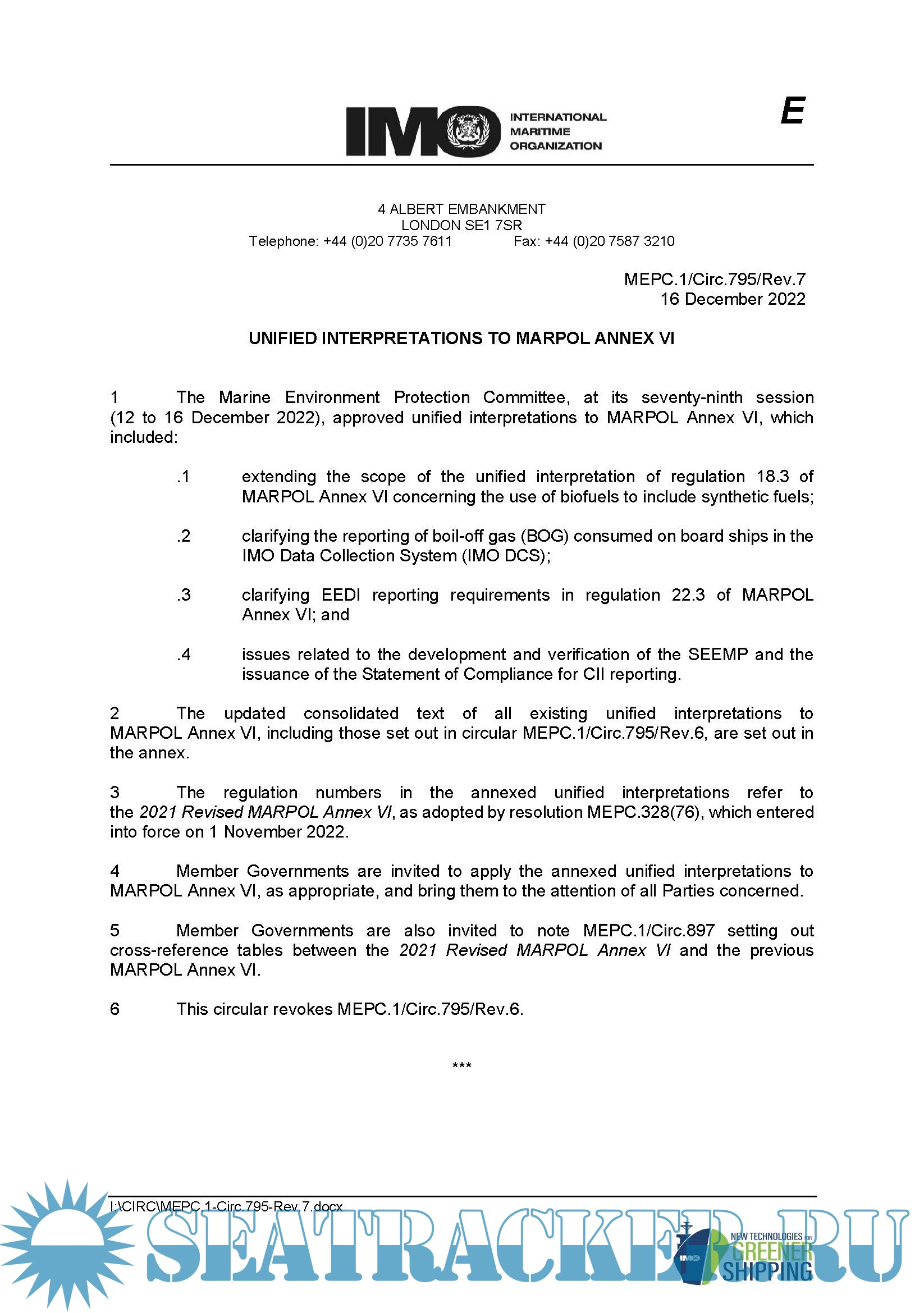 Description: The Marine Environment Protection Committee, at its seventy-ninth session (12 to 16 December 2022), approved unified interpretations (MEPC.1/Circ.795/Rev.7) to MARPOL Annex VI, which includes:
