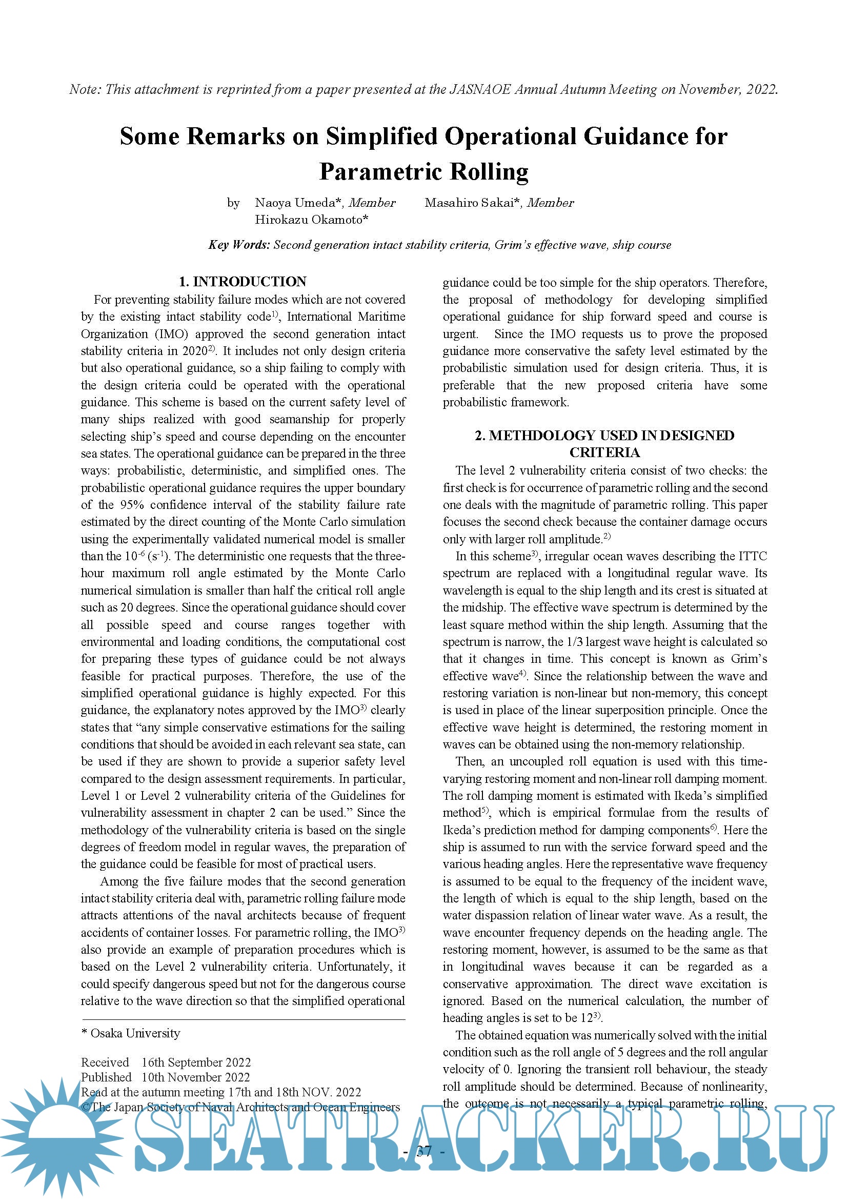 to parametric rolling. A variety of measures for avoiding parametric rolling have also been developed and
