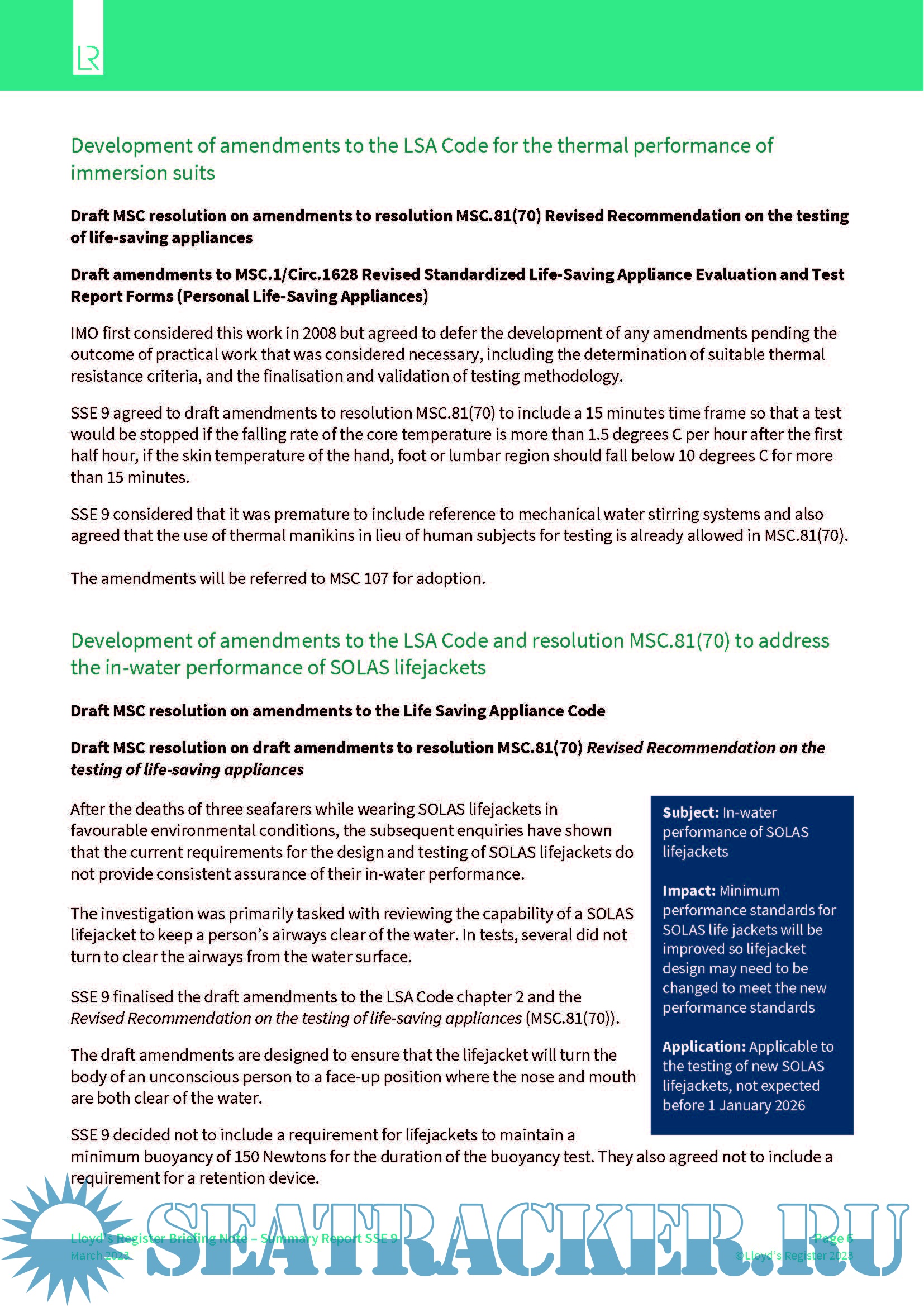 LR Summary Report for the IMO Ship Systems and Equipment Sub-Committee (SSE 9)