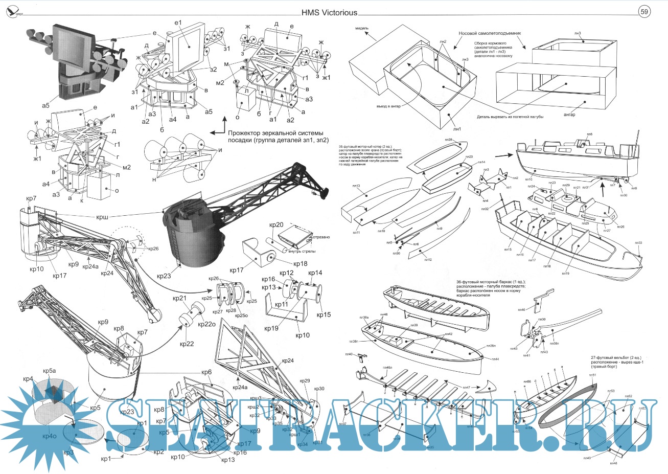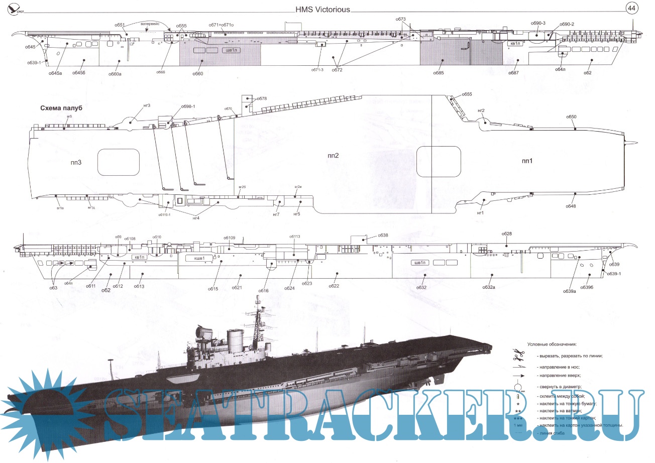 89 листов цветных выкроек и схем сборки для создания модели в масштабе 1:200 ударного авианосца "Victorions" Великобритания по состоянию на 1964 годСкриншоты