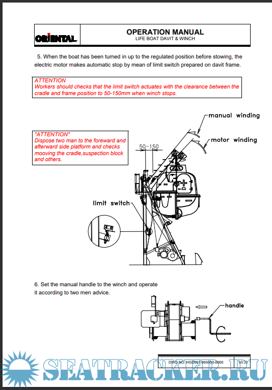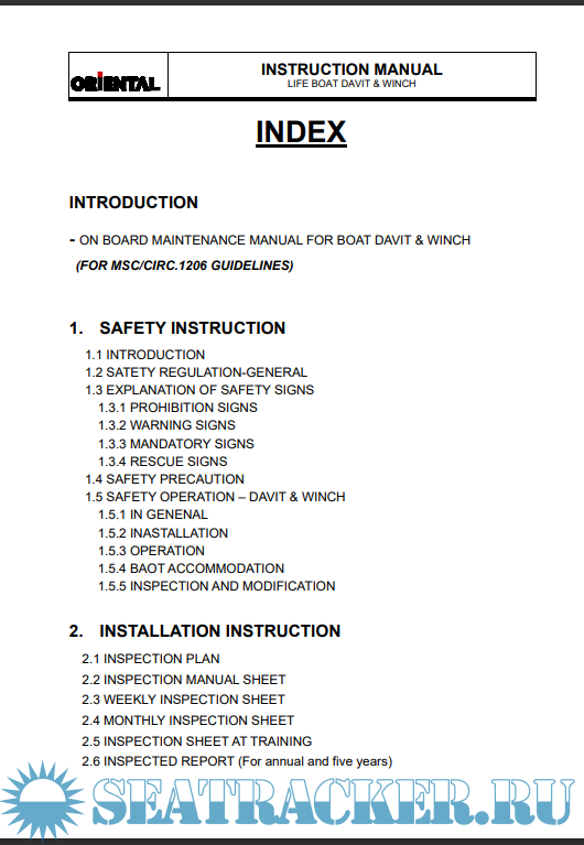 Description: This instruction manual is prepared in accordance with the MSC/Circ.1206 Guidelines for periodic Servicing and Maintenance of boat davit & winch. Annual check, servicing and repair should be performed by the ship’s crew in the presence of the manufacture’s repair tentative or a person appropriately trained and certified of the manufacturer for the work to be done. Please refer to the instruction and maintenance manual for boat davit & winch manufactured after the Reg. of SOLAS.