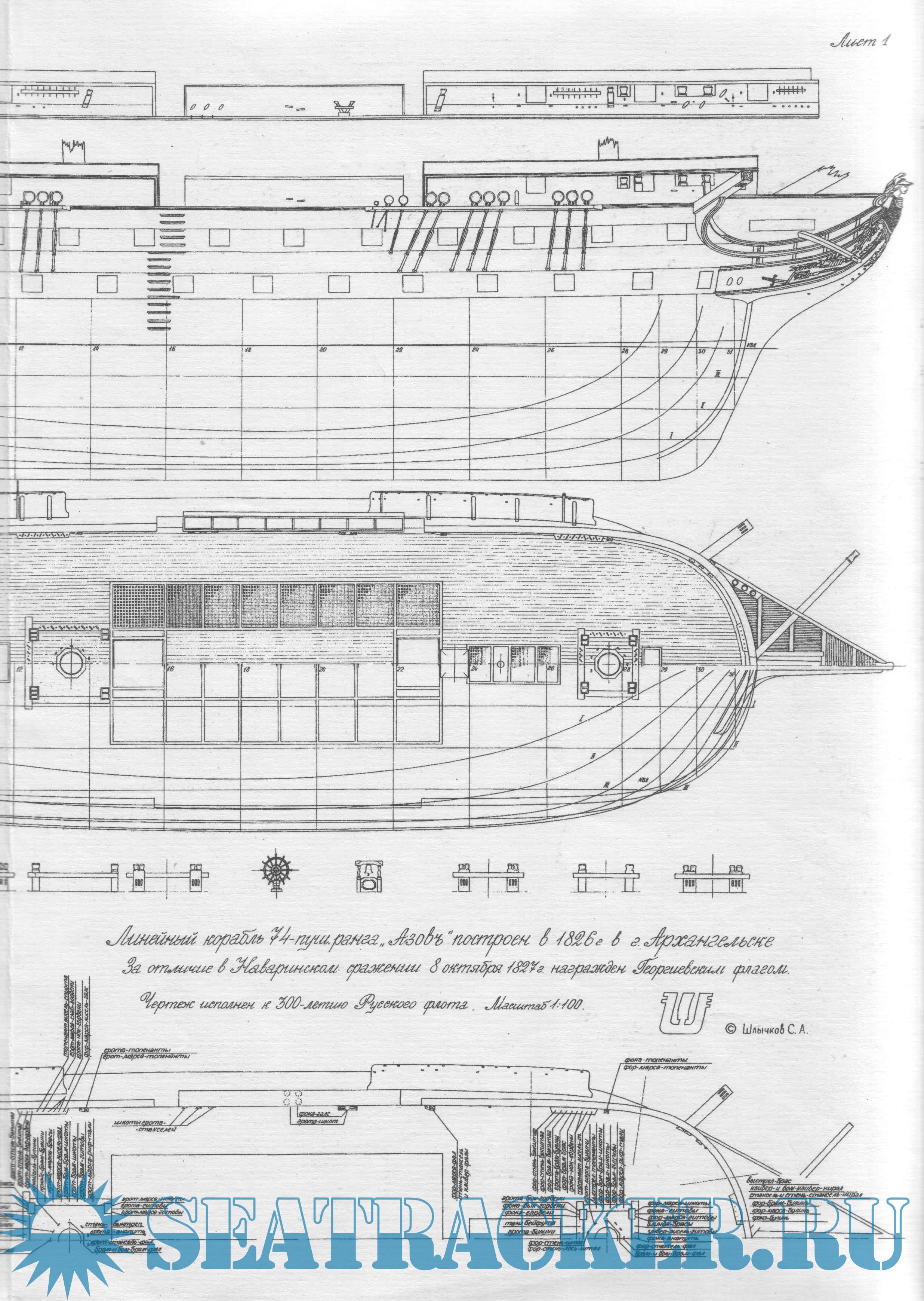 Чертежи 74-пушечного линейного корабля "Азов" в масштабе 1:100
