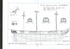 Исходя из этих данных, были изучены чертежи английских шлюпов подобных размерений конца 18, начала 19 веков, на основании которых был изготовлен предлагаемый чертеж. Надо отметить, что английская корабельная архитектура того времени несколько отличалась от принятой в России, да и класс кораблей - шлюп, для Русского флота не типичен.