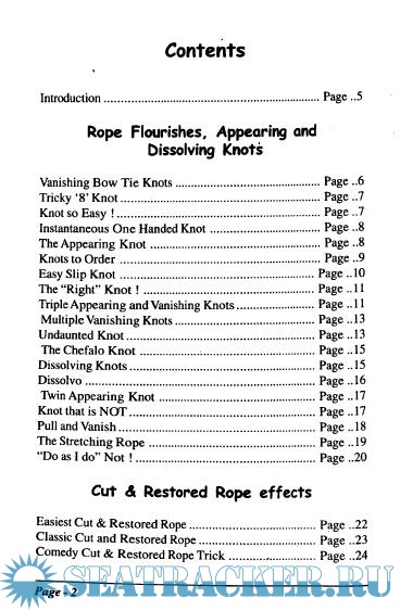 Year: 2002 Language: english Author: Dalal S. Genre: Manual Publisher: Electro Fan Edition: 1st Format: PDF Quality: Scanned pages Pages count: 48 Description: There are hundreds of tricks you can perform with a piece of rope. The most famous of these is the cut & restored rope trick, where a piece of rope is cut into two or more pieces and magically restored. - Rope flourishes, appearing and dissolving knots. - Cut & restored rope effects. - Rope penetrations and other rope tricks