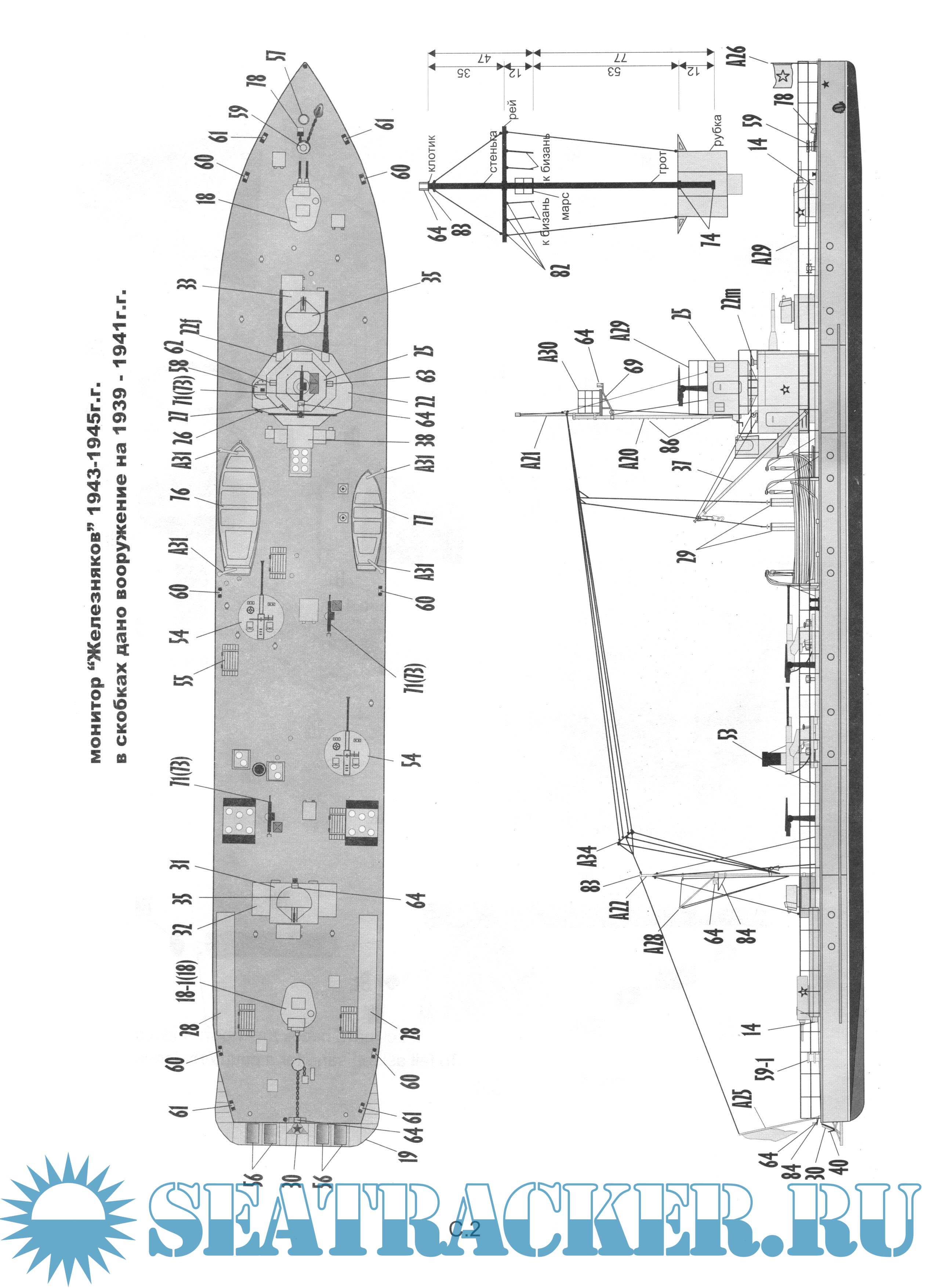 Описание: Монитор «Железняков» — головной корабль проекта СБ-37 завода «Ленинская кузница». Все шесть мониторов этого проекта были названы в честь моряков — героев Гражданской войны. «Железняков» получил имя А. Г. Железнякова — знаменитого «матроса Железняка».