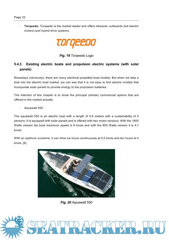Year: 2018 Language: english Author: Bigorra E.M. Genre: Research papers Publisher: Universitat Politècnica de Catalunya Format: PDF Quality: eBook Pages count: 84 Description: Existing boat market demands highlight the need to identify eco-friendly solutions which can compete with the actual fuel based propulsions and reduce the greenhouse effect in the earth and the noise produced in the sea. Today, sailboats are the main boat type in the market that can be equipped with solar panels. Other electric boat models also exist, however they have low speed specifications. Thus, the aim of this thesis is propose an electric propulsion system equipped with solar panels that can compete with fuel-based boats in terms of speed. This electric propulsion system pretends to fulfil one of the weaknesses of the actual electric boat market, where (equipped with solar panels supplying the propulsion batteries) only some sailboats and low speed motorboats are offered. To do so, the different main components (i.e the motor, the batteries and the solar panels) have been studied and chosen. In addition, a components connection scheme has been proposed. Besides of the motor and the batteries, the solution consists of a hardtop structure with solar panels placed on the roof in order to increase the available area to place the solar panels. To verify performance conditions, the hardtop design has been tested by FEM simulation (using ANSYS Workbench and Fluent) in different conditions (solar panels weight, snow conditions and wind conditions). In addition, with the aim to increase the vision factor between the sun and the solar panels installed in the roof of the hardtop, a solar panels orientation system has also been conceptually designed. In addition, with a few modifications in the hardtop structure the proposed electric propulsion system can be installed in any boat of an approximate range from 4,5 meters to 6,5 meters. Results indicate that weight of the designed propulsion system is higher than a conventional fuel propulsion system. However, the difference is not significant and it could be assumed by the hull of the boat. In the future, it is of interest to further develop the solar panels orientation system, realize an own design of the components and to analyse in deeper detail the adaptability of the proposed propulsion system to other boat models. Additional info: