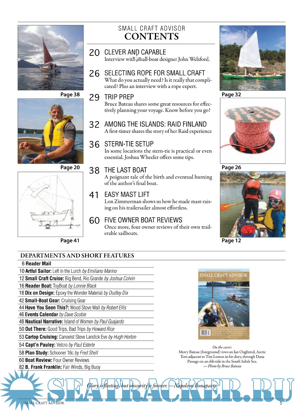 Year: 2019 Language: English Author: Craig Wagner & Joshua Colvin Genre: Periodical (magazine) Edition: #118, July, August 2019 Format: PDF Quality: eBook Pages count: 84 Description: Small boats, big adventure! The only magazine focused on small and trailerable sailboats, cruising, and adventure. Each issue features places to sail, how-to and modification articles, a plan study for the boat builder, and a feature-length review of a production sailboat.