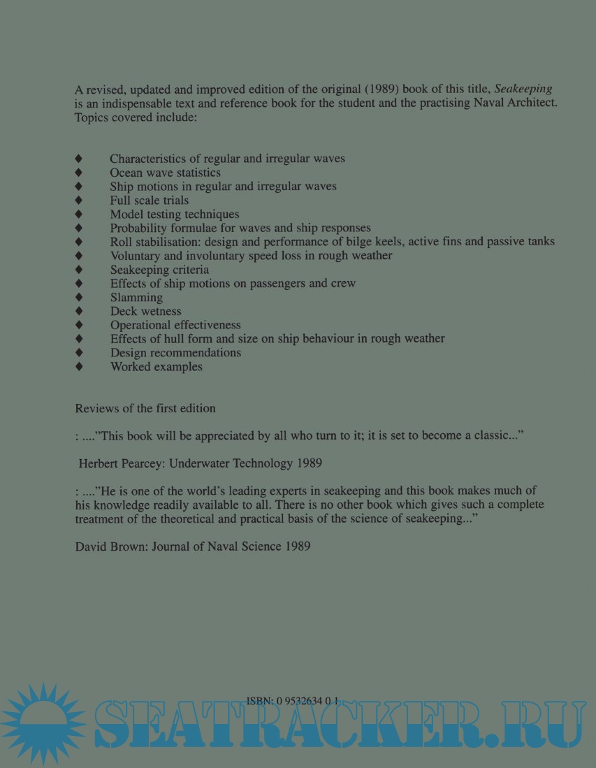 Year: 1998 Language: english Author: Adrian R.J.M. Lloyd Genre: Technical book ISBN: 978-0953263400 Format: PDF Quality: Scanned pages Pages count: 396 Description: An examination of all aspects of the behaviour of ships in rough weather, designed as a reference work for those involved in ship-building and the design of seagoing vessels. The text will also be of interest to sailors and engineers concerned with the action of waves and the sea.
