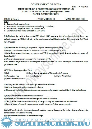 Description: Question Paper Set for Phase I (Chief Mate F.G.) Mercantile Marine Department (MMD), India Examinations