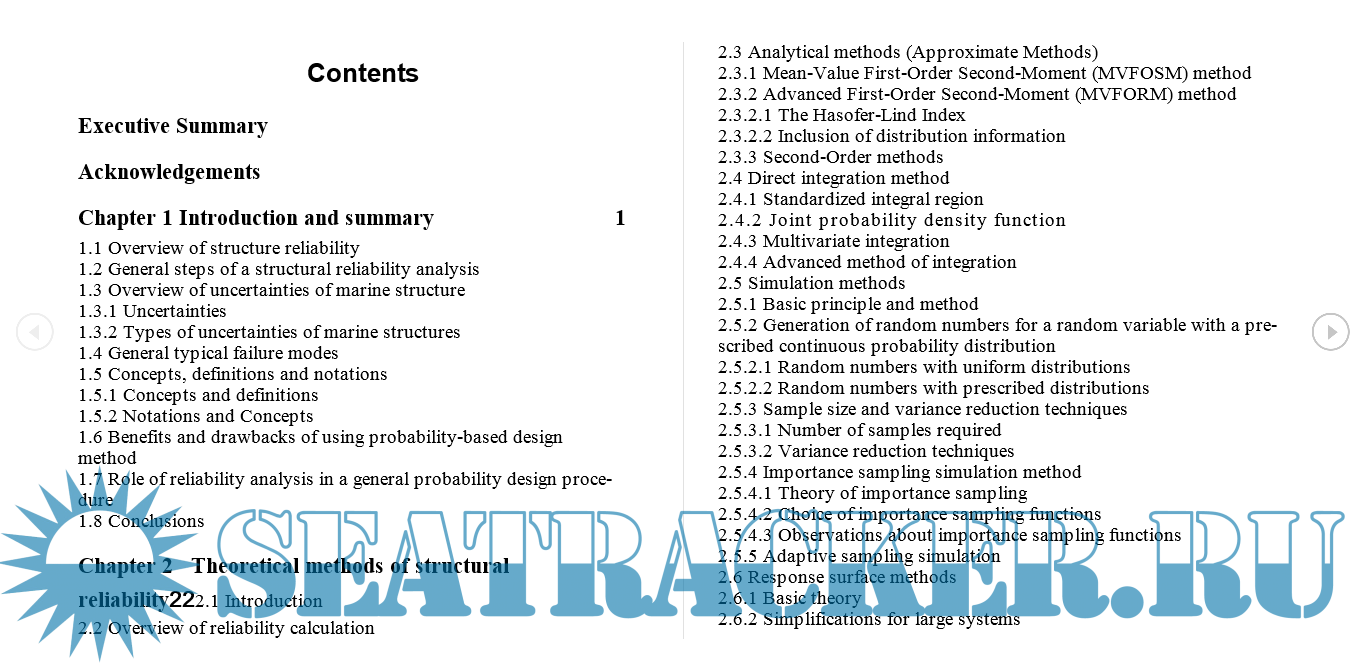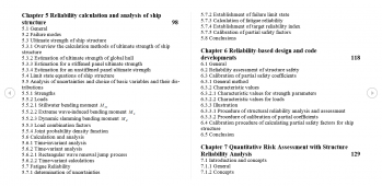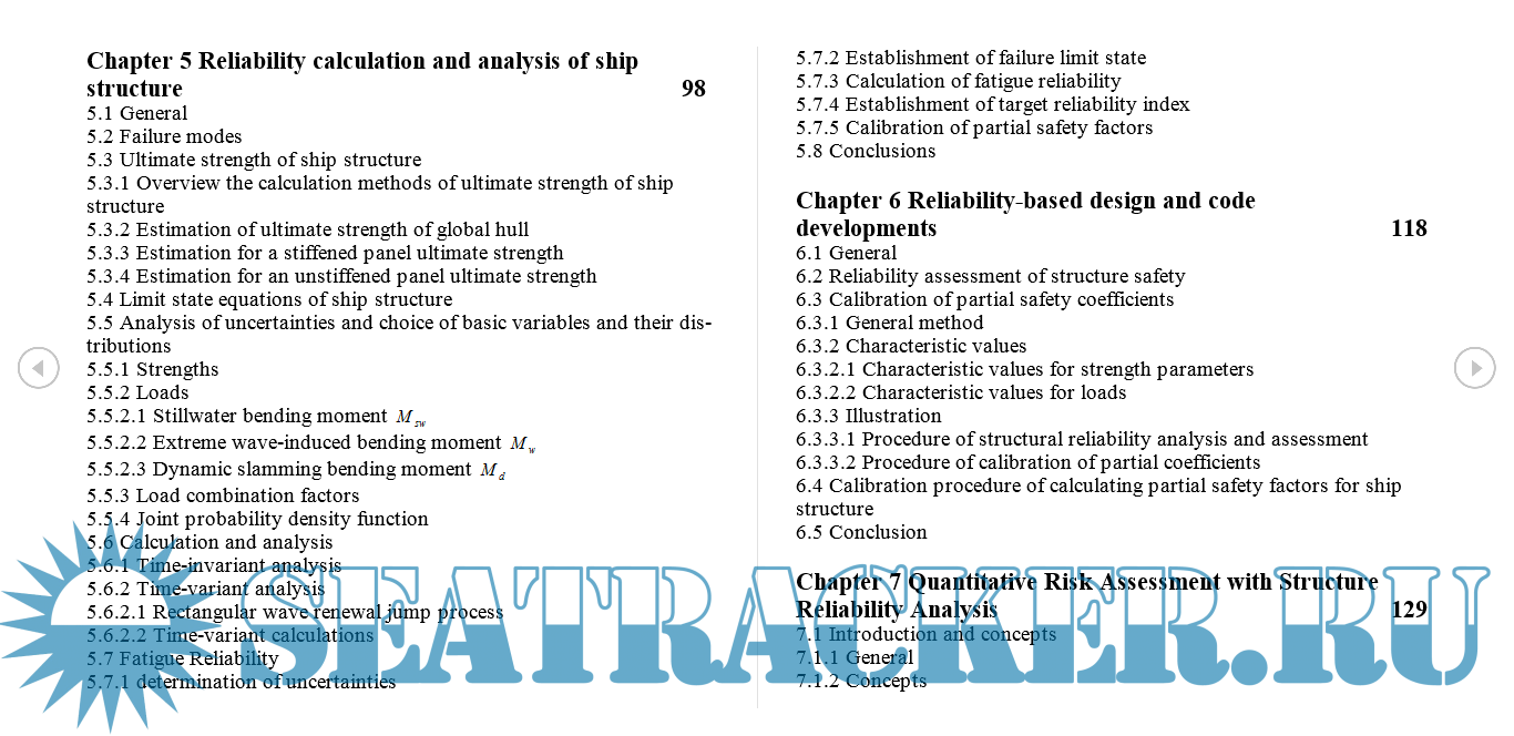 In chapter 5, the procedure of calculating reliability of ship structure is introduced in detail, including identity of failure modes, calculation of loads and strength of ship structures, establishment of limit state functions, etc. Time-variant computations are outlined. Fatigue reliability is introduced.