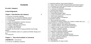 In chapter 2, the basic theories and methods of reliability are presented in detail. Analytical methods (approximate methods) are introduced. The direct integration method is presented, including the techniques of standardized integral region, joint probability density function, multivariate integration and advanced method of integration. Monte Carlo simulation methods and response surface methods are presented, including basic theory, with simplifications for large systems, iterative solution scheme and response surface and finite analysis etc. Suggestions are given for choosing reliability methods.