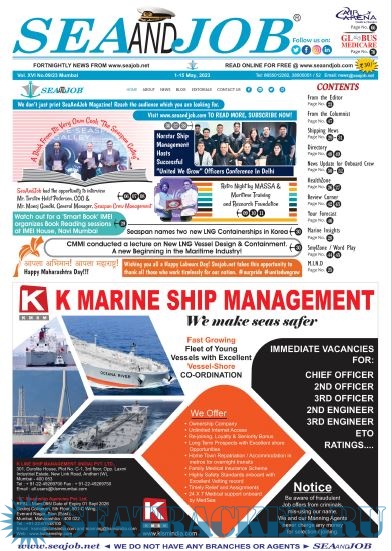 Description: The Sea and Job magazine launched in May 2007, was the second venture of Sea Line Group succeeding 'seajob.net' bringing the much renowned essence to the Group, the Sea and Job Magazine quickly gained popularity, becoming the No. 1 Shipping Magazine that came to be widely circulated all over India. Sea and Job over the years has evolved as the most trusted, ethical, objective and read maritime publication that possesses a large database of subscribers from various verticals in the industry.The magazine provides informative and interesting articles covering not just the shipping world but also the world outside it.Sea and Job is also a medium for the shipping/ manning companies to advertise marine jobs and also to promote their organization by publicizing internal activities like seminars, sports events and parties.Some notable endeavors of the magazine include the Know Your Recruiter Column, the Sailing Episodes Column and the Marine Insights section. The consistent efforts and the dedication to provide extraordinary services to the industry has resulted in the magnifying popularity and patronage of Sea and Job.