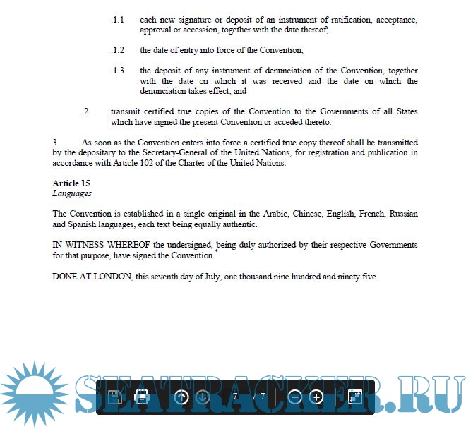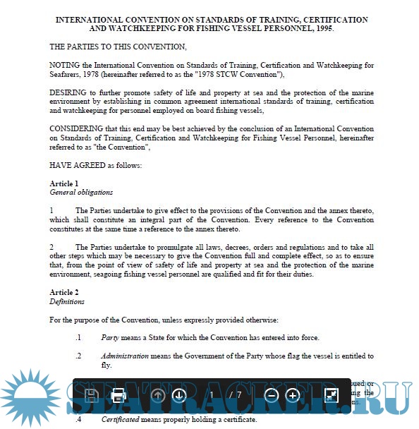 Year: 1995 Language: english Author: IMO Genre: Convention (rules) Publisher: International Maritime Organization (IMO) Format: PDF Quality: eBook Pages count: 7 Description: The International Convention on Standards of Training, Certification and Watchkeeping for Fishing Vessel Personnel (STCW-F), was adopted by IMO in 1995. The 1995 STCW-F Convention is a binding treaty that sets certification and minimum training requirements for crews of seagoing fishing vessels with the aim to promote the safety of life at sea and the protection of the marine environment, taking into account the unique nature of the fishing industry and the fishingworking environment. This Convention generally applies to personnel of seagoing fishing vessels and, in particular, to skippers and officers in the deck department of fishing vessels of 24 metres in length and over, and officers in the engine department of fishing vessels of powered by main propulsion machinery of 750 kW propulsion power or more. Additional info: Adoption: 7 July 1995 Entry into force: 29 September 2012