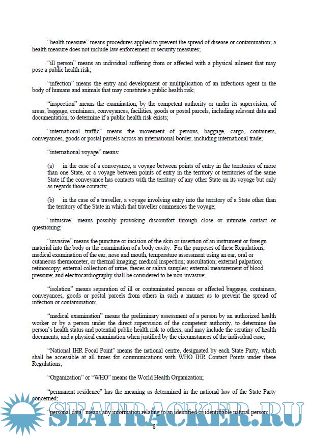 Description: The International Health Regulations (“the IHR” or “Regulations”) were adopted by the Health Assembly in 19691, having been preceded by the International Sanitary Regulations adopted by the Fourth World Health Assembly in 1951. The 1969 Regulations, which initially covered six “quarantinable diseases” were amended in 19732 and 19813, primarily to reduce the number of covered diseases from six to three (yellow fever, plague and cholera) and to mark the global eradication of smallpox.