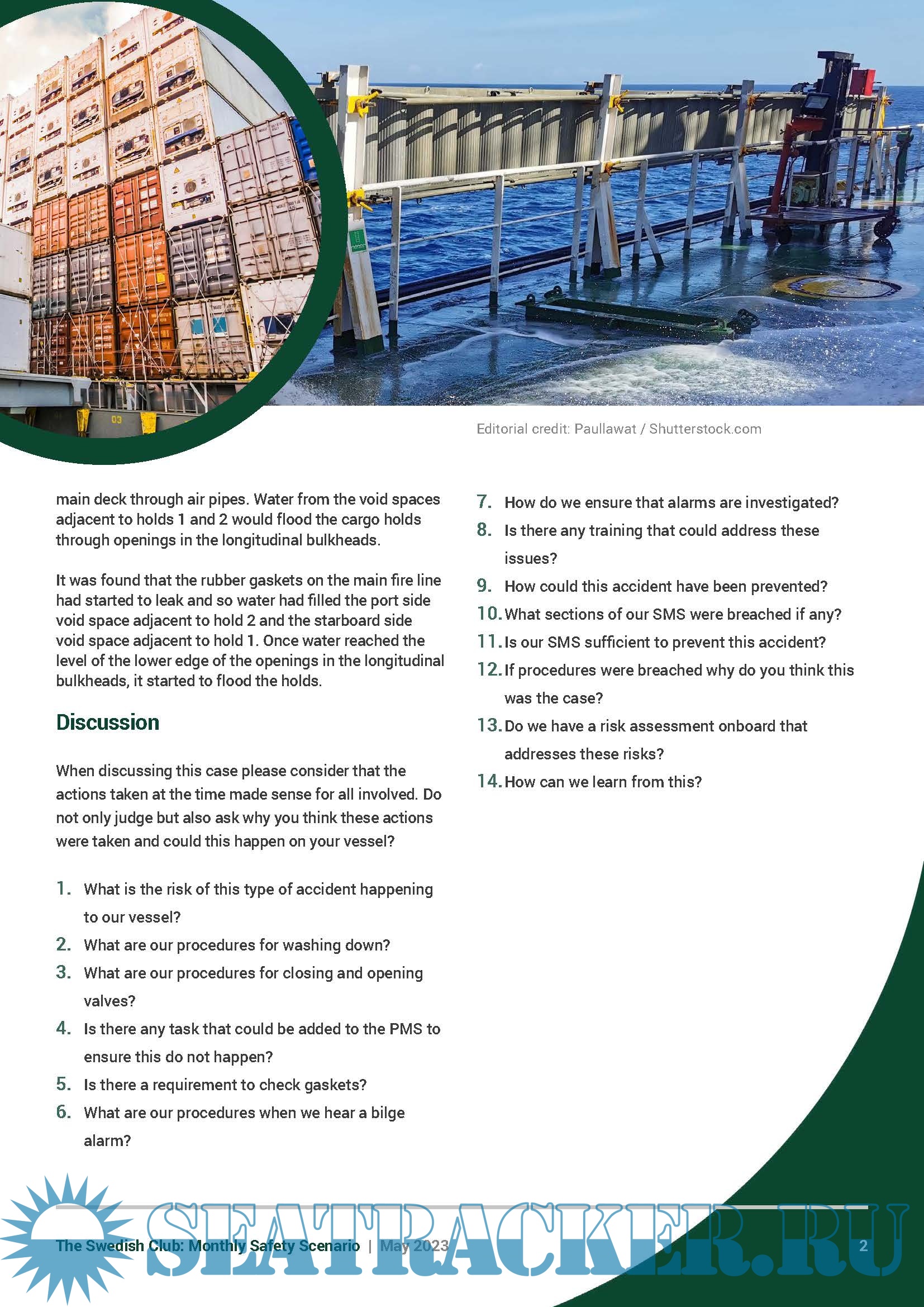 Year: 2023 Language: english Author: the Swedish Club Genre: Periodical (magazine) Format: PDF Quality: eBook Pages count: 3 Description: Under the ISM requirement, owners are obliged to carry out monthly safety meetings or safety committee meetings onboard their vessels. This obligation stems from Chapter 5 of the ISM Code: “Master’s responsibility and authority” and furthermore from “5.1.2, motivating the crew in the observation of that policy”. The Club is publishing, on a monthly basis, a new Monthly Safety Scenario (MSS) to assist owners in their efforts of complying with the above regulations. Alternative scenarios will be uploaded in SCOL. It is easy to download the MSS and enter the written conclusions from the meeting and send feedback to the shore-based organisation. Issue May, 2023
