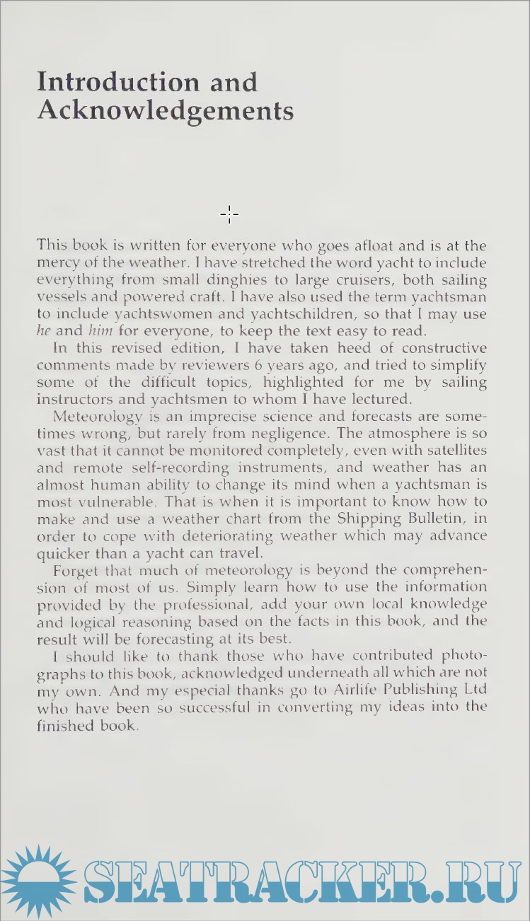 "This book is written for everyone who goes afloat and is at the mercy of the weather. I have stretched the word yacht to include everything from small dinghies to large cruisers, both sailing vessels and powered craft. I have also used the term yachtsman to include yachtswomen and yachtschildren, so that I may use he and him for everyone, to keep the text easy to read.