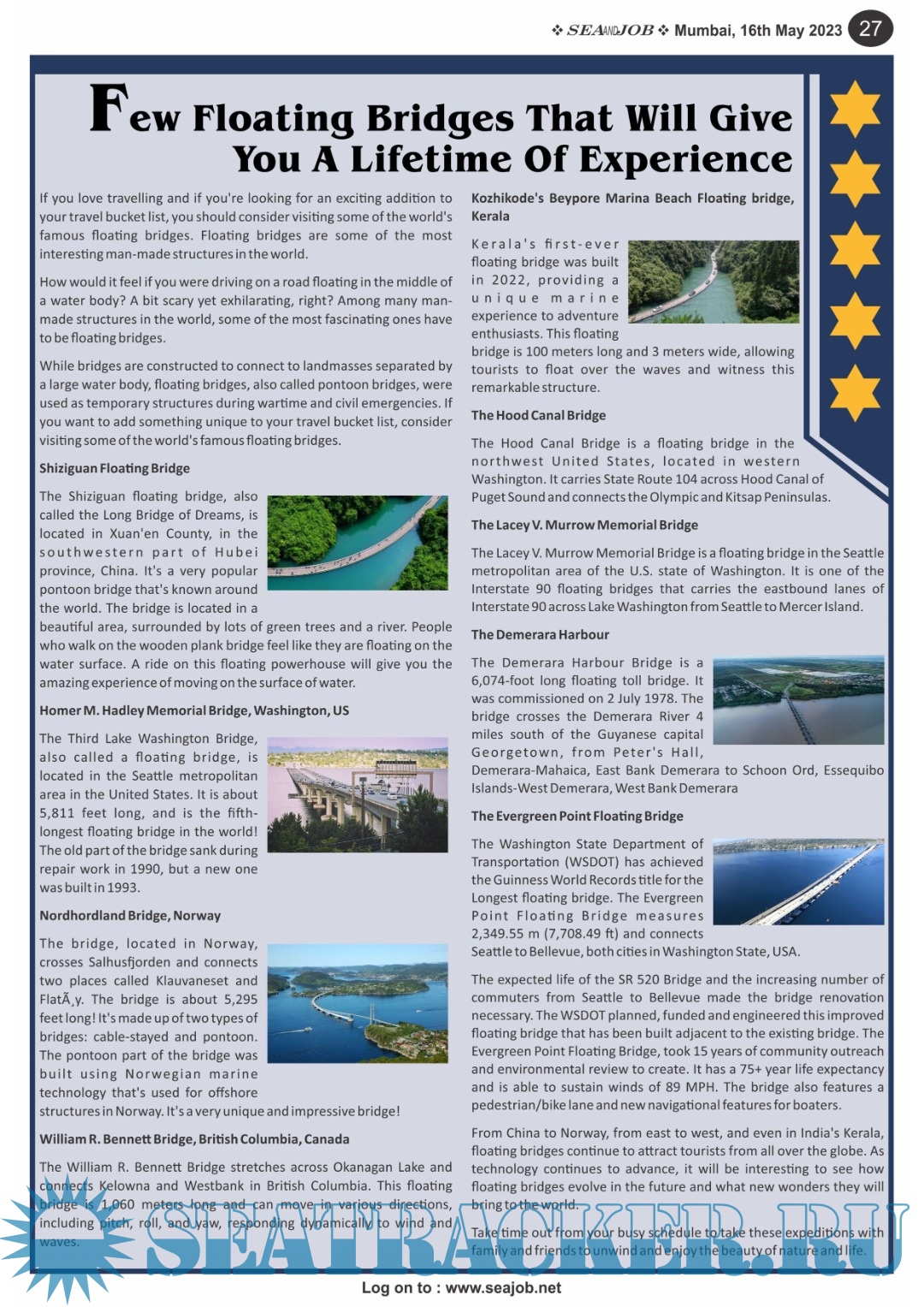 Year: 2023 Language: english Author: Sea Line Group Genre: Periodical (magazine) Edition: Vol. XVI, No. 10/23 Format: PDF Quality: eBook Pages count: 68 Description: The Sea and Job magazine launched in May 2007, was the second venture of Sea Line Group succeeding 'seajob.net' bringing the much renowned essence to the Group, the Sea and Job Magazine quickly gained popularity, becoming the No. 1 Shipping Magazine that came to be widely circulated all over India. Sea and Job over the years has evolved as the most trusted, ethical, objective and read maritime publication that possesses a large database of subscribers from various verticals in the industry.The magazine provides informative and interesting articles covering not just the shipping world but also the world outside it.Sea and Job is also a medium for the shipping/ manning companies to advertise marine jobs and also to promote their organization by publicizing internal activities like seminars, sports events and parties.Some notable endeavors of the magazine include the Know Your Recruiter Column, the Sailing Episodes Column and the Marine Insights section. The consistent efforts and the dedication to provide extraordinary services to the industry has resulted in the magnifying popularity and patronage of Sea and Job. Additional info: 16-31 May 2023.