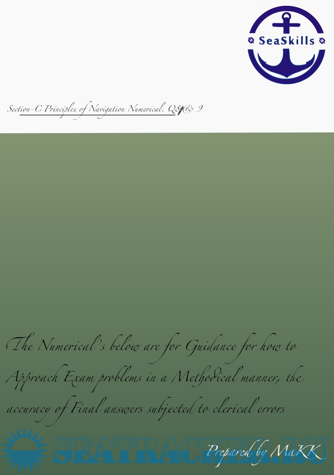 Year: 20xx Language: english Author: Makk Publisher: Seaskills Maritime Academy , Coimbatore, India Format: PDF Quality: eBook Pages count: 25 Description: Paper: Terrestrial and Coastal Navigation. Section C: Principle's of Navigation (Q 8 & 9) solved from Past Question Papers of Mercantile Marine Department (MMD), India Examinations for Phase I (Chief Mate F.G.)