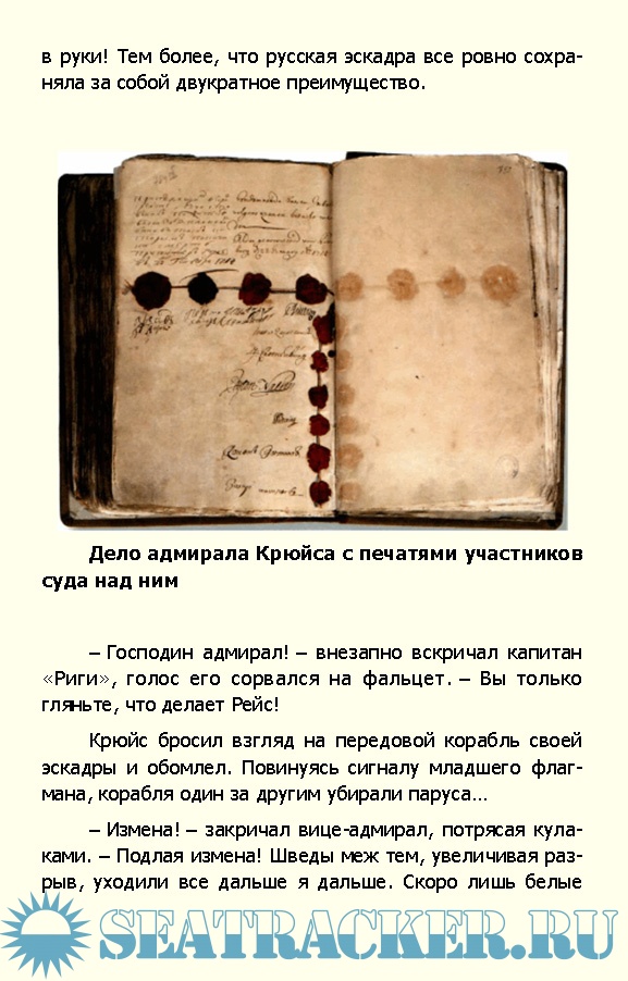 Интересная книга, которая рассказывает о создании впжного морского закона и его создателе Кононе Зотове. Петр I набирал капитанов из-за границы, и случилось одно событие, которое заставило Императора практически подойти к созданию морского устава. Событие, это 8 наших кораблей погнались за3-я шведскими и все говорило об успехе. Но вот флагманский корабль сел на камень, англичанин не понял сигнал голандский и также поставил второй корабль на камень, а младший флагман агличанин также не правильно прочитал голландский сигнал и прекратил погоню.Скриншоты