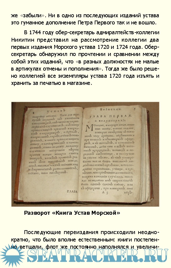 Описание: Наверное, ни один из законов России но имеет столь славной истории, как Морской устав Петра Великого. Принятый в 1720 году, он просуществовал до эпохи парового флота, да и в последующее время многие его главы так и остались неизменными.