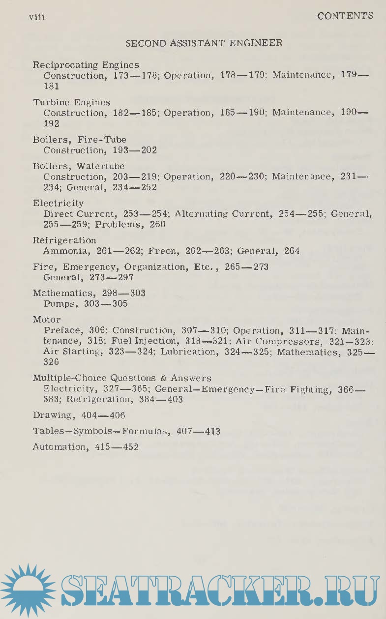 Description: The purpose of this publication is to make available to per­sonnel of the American Merchant Marine specimen questions and answers which will serve as a guide to appropriate study for li­censes in the various grades of marine engineer.
