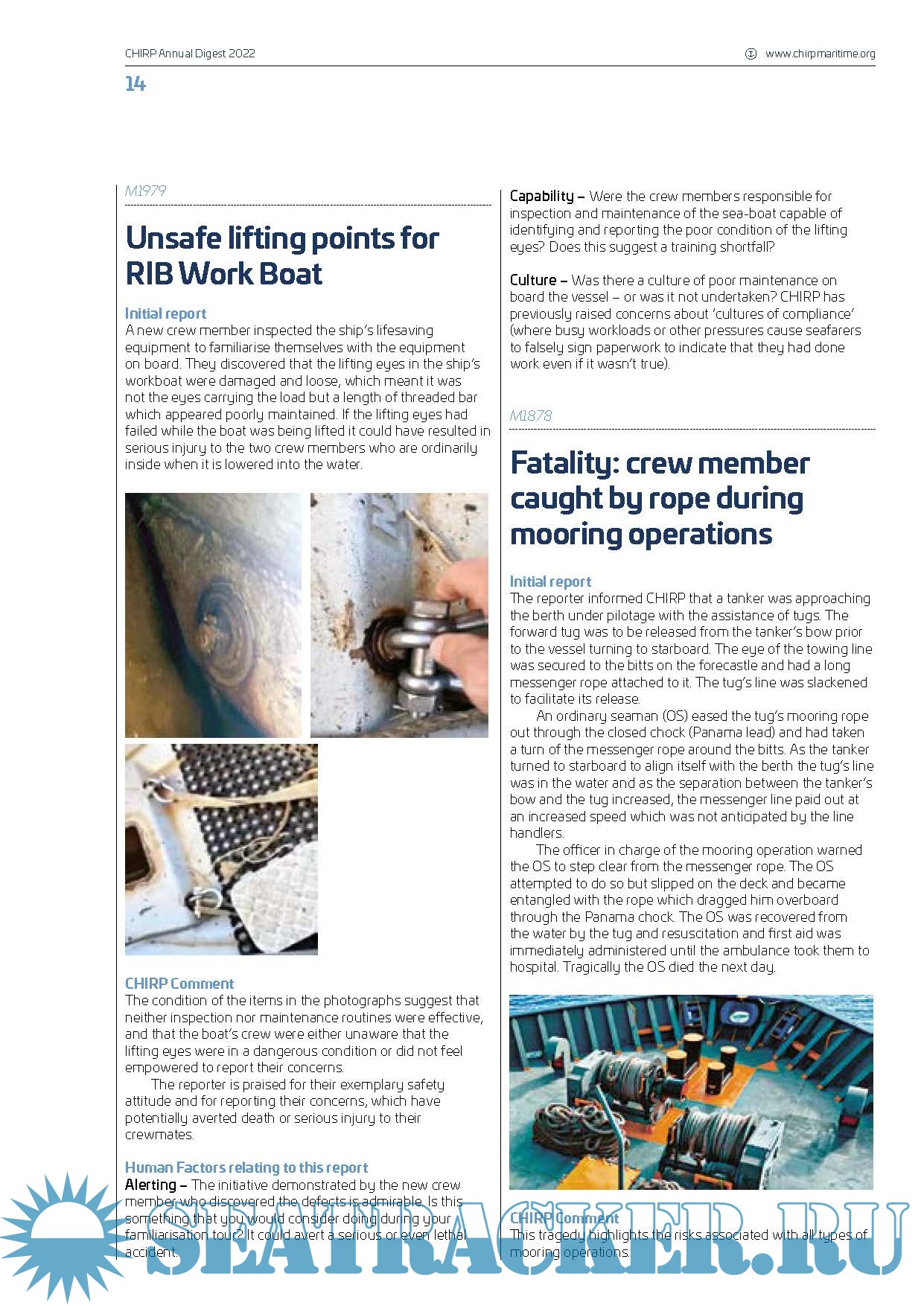 Year: 2023 Language: english Author: CHIRP Maritime Genre: Periodical Format: PDF Quality: eBook Pages count: 70 Description: This publication contains summaries of all cases published by CHIRP (Confidential Human Factors Incident Reporting Programme) during 2022. CHIRP Maritime aims to improve maritime safety by providing an independent and confidential reporting system for all individuals employed in or associated with the industry, analysing data and identifying safety trends and informing the community of safety related reports and trends. The Digest categorises incidents according to human factors, deck safety, engineering, technological, environmental, pilotage, COLREGs/navigation, safety culture and health and etc