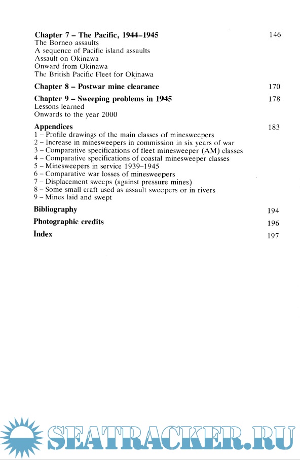 Description: A useful general history, concentrating on the European theater with more detailed accounts of specific operations (e.g. the clearing of the Scheldt) and some anecdotal content. It describes the mines themselves, together with sweeping techniques and formations. Appendices include profiles of minesweeper classes, operational strengths by year, comparative specifications, war losses, and other technical data.