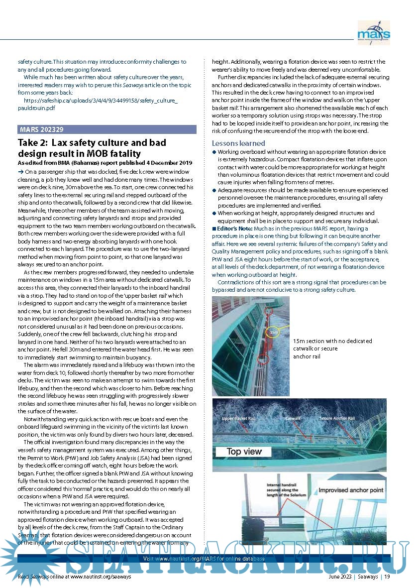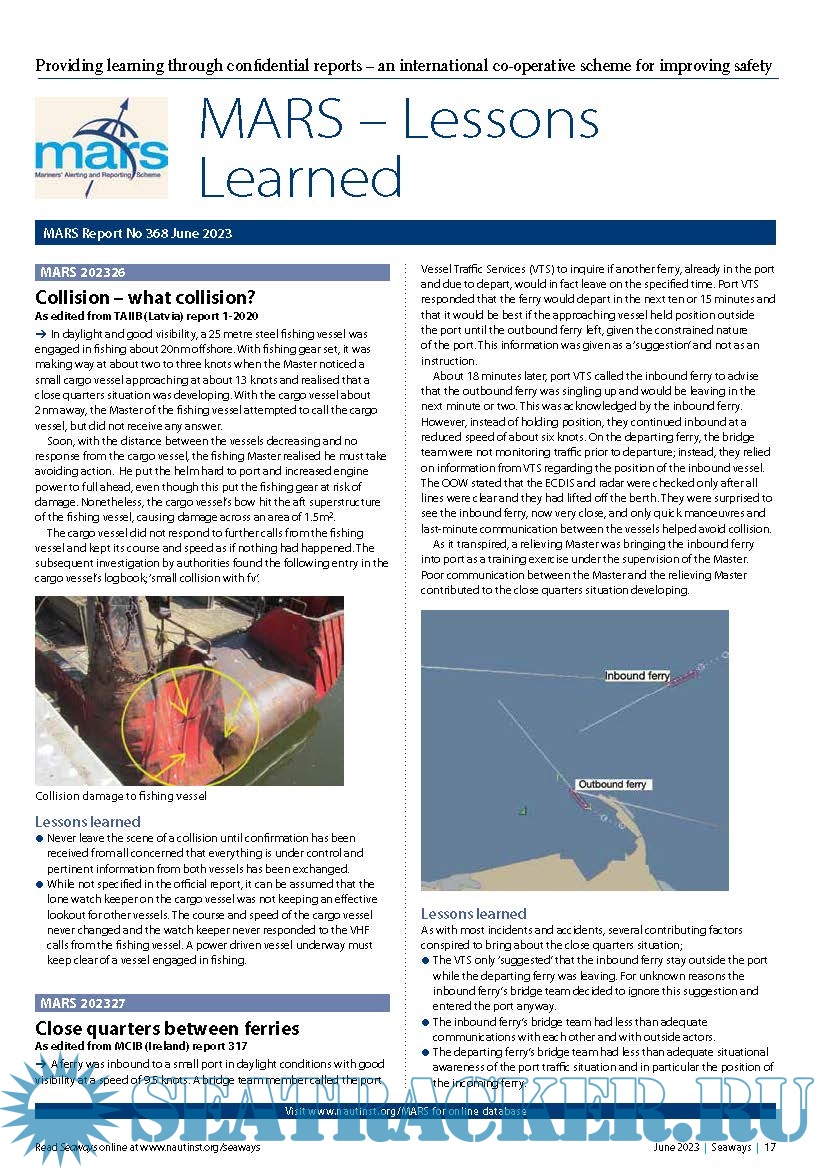 Year: 2023 Language: english Author: The Nautical Institute Genre: Periodical (magazine) Format: PDF Quality: eBook Pages count: 4 Description: MARS Report No.368 June, 2023 Providing learning through confidential reports – an international co-operative scheme for improving safety.MARS is a searchable database containing reports of accidents and near misses stretching back over a quarter of a century. Funded through the generous support of the Institute's Nautical Affiliate partners, it is one of the maritime industry's leading risk reduction initiatives and is helping to make life safer for seafarers everywhere.